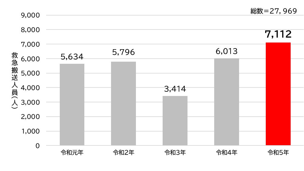 東京消防庁管内で実施した調査(※2)によると、過去5年間(各年6月から9月まで)に、27,969人が熱中症(熱中症疑い等を含む)により救急搬送されています。2023年(令和5年)の熱中症による救急搬送人員は過去5年間で最も多い7,112人で、2022年(令和4年)と比較すると1,099人増加しており、近年、猛暑が続く日本において、熱中症は重大な社会問題となっています。
