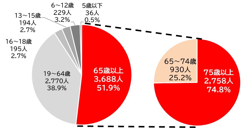 熱中症になる年齢の区分別では、65歳以上の高齢者が3,688人で全体の約半数を占め、そのうち約7割にあたる2,758人が75歳以上の後期高齢者でした。高齢者は暑さや水分不足に対 する感覚機能や体の調整機能も低下しているので注意が必要です。