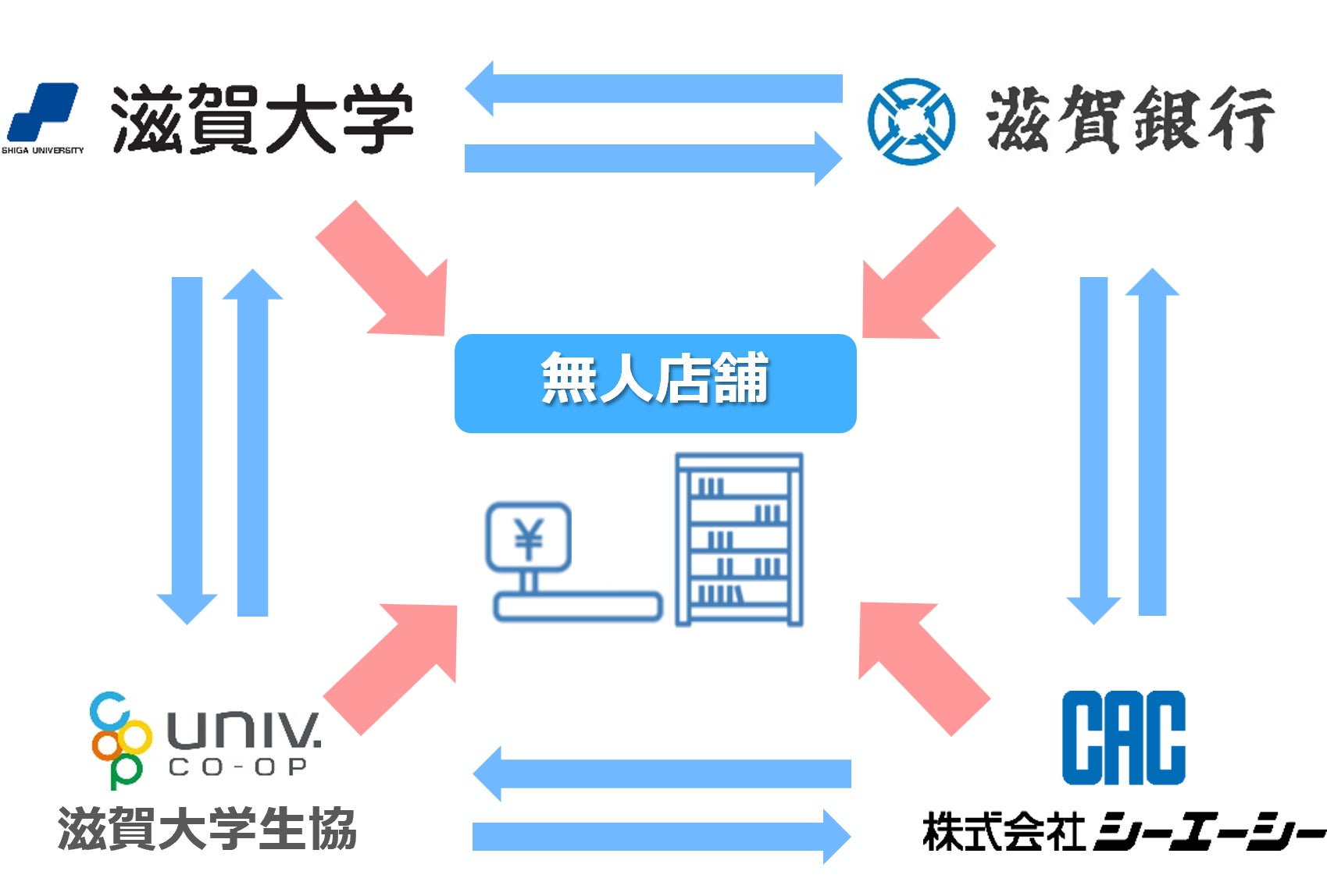 国立大学法人滋賀大学(本部:滋賀県彦根市、学長:竹村彰通、以下 滋賀大学)、滋賀大学生活協同組合(本部:滋賀県彦根市、以下 滋賀大生協)、株式会社滋賀銀行(本社:滋賀県大津市、代表取締役頭取:久保田真也、以下 滋賀銀行)、および株式会社シーエーシー(本社:東京都中央区、代表取締役社長:佐別當宏友、以下CAC)は、4者の「産学金連携」による取り組みとして、滋賀大学学生・教職員の買物支援のために、「滋賀大学彦根キャンパス」(滋賀県彦根市)のイニシアティブ棟構内に、顔認証決済の技術を活用した無人店舗(以下、本店舗)を2026年3月5日(木)にプレオープンし、同年3月25日(水)10:00に正式オープンすることをお知らせします。