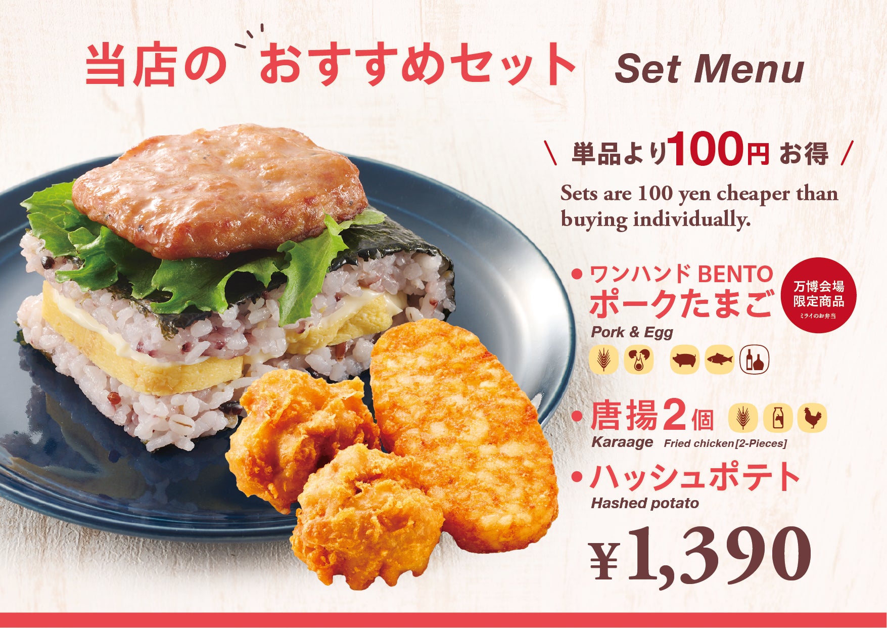 ワンハンドBENTOの各種類に、唐揚2個とハッシュポテトがついて、単品で購入するよりも100円(税込)お得なセット価格になっています。