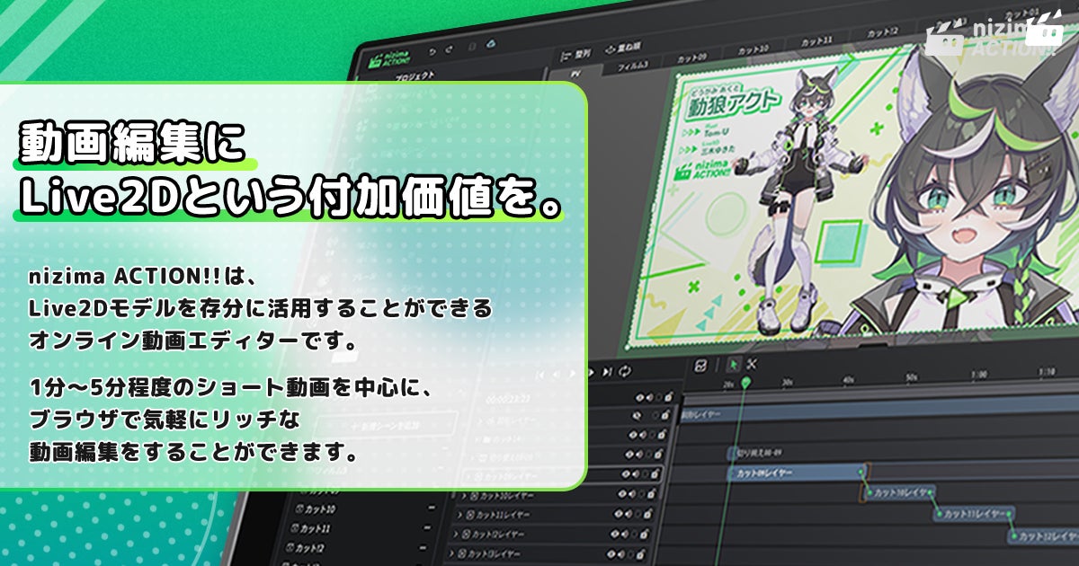 「nizima ACTION!!(ニジマ アクション)」は、Live2Dモデルを存分に活用できるオンライン動画エディターです。1分~5分程度のショート動画を中心に、ブラウザで気軽にリッチな動画編集をすることができます。