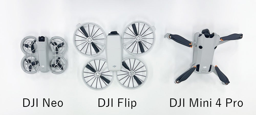 DJI Flipは販売されているドローンの中では小型の位置づけとなります。展開時の比較写真は以下の通りです。