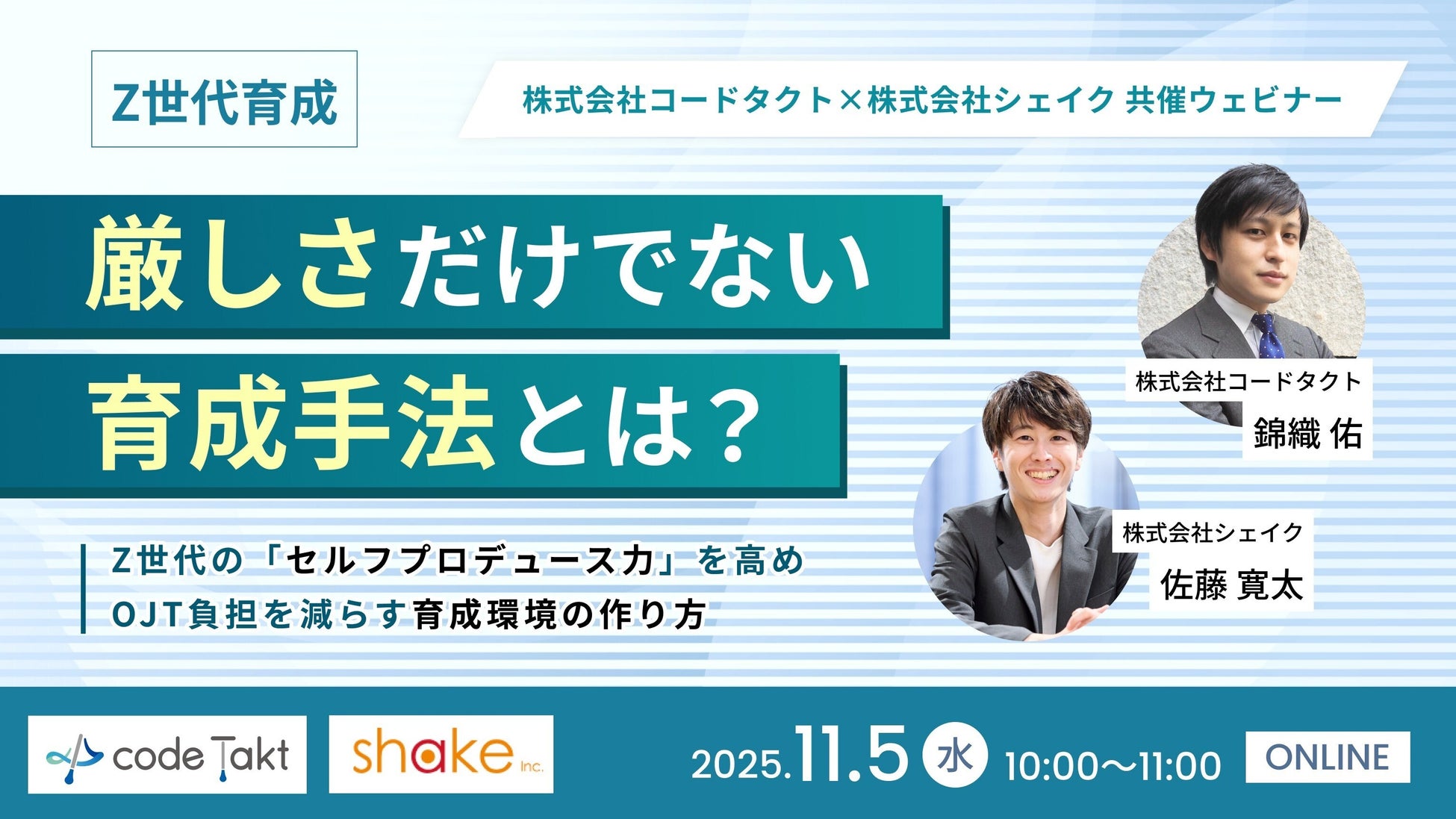 リフレクション・マネジメントシステム「チームタクト」を提供する株式会社コードタクト(本社:東京都渋谷区、代表取締役CEO:後藤正樹)は、人材育成や組織コンサルティングを手掛ける株式会社シェイクと共催し、企業の人事・育成担当者を対象としたウェビナー(無料)を2025年11月5日(水)に開催します。