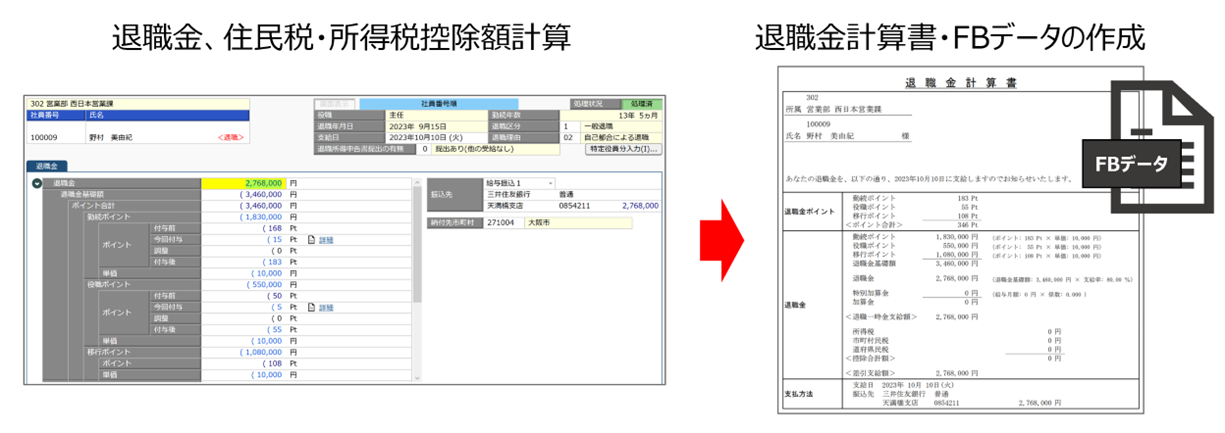 社員退職時には、退職金の金額を自動計算します。ポイント算定期間中に退職した場合の按分計算にも対応でき、所得税や住民税も自動計算するため、計算ミス防止や作業時間の大幅削減を実現します。また、退職金計算の内訳を示した「退職金計算書」を出力できるほか、振込用のFBデータを作成できます。