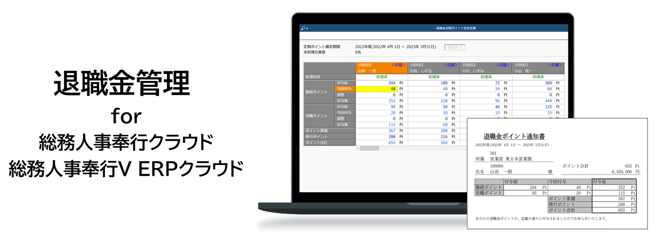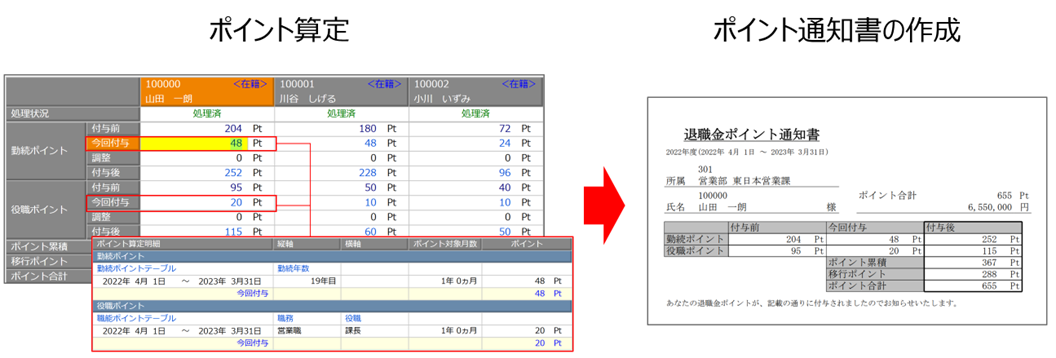 ポイント算定期間の社員情報をもとに付与ポイントが自動計算されるため、計算ミスがなくなり作業時間を大幅に削減できます。また、従業員へ付与されたポイントやポイントの合計を通知する「退職金ポイント通知書」が自動作成されます。