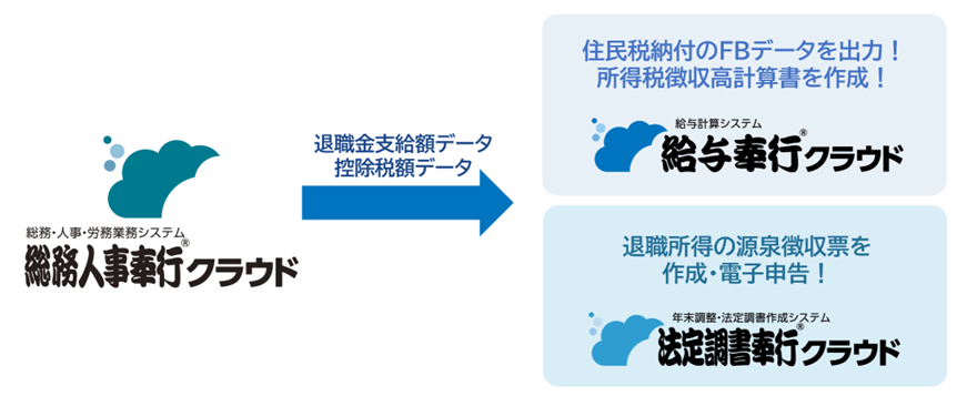 『給与奉行クラウド』・『法定調書奉行クラウド』と一緒に利用することで、住民税・所得税の納付と退職所得の源泉徴収票の作成まで一気通貫でデジタル化できます。