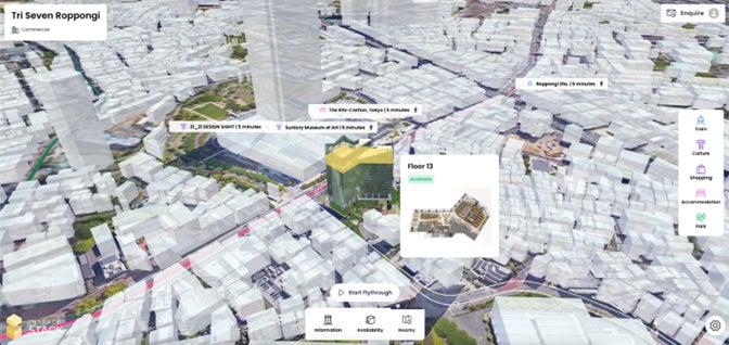 CBREのランドロード・レプリゼンテーションチームでは、クライアントであるペンブローク リアルエステート ジャパンが開発を手掛け、管理運営も行っている「TRI-SEVEN ROPPONGI」において、INSPACEの3Dスタッキングとバーチャルツアーを導入したマーケティング活動を展開し、リーシング強化と業務の効率化を図っています。