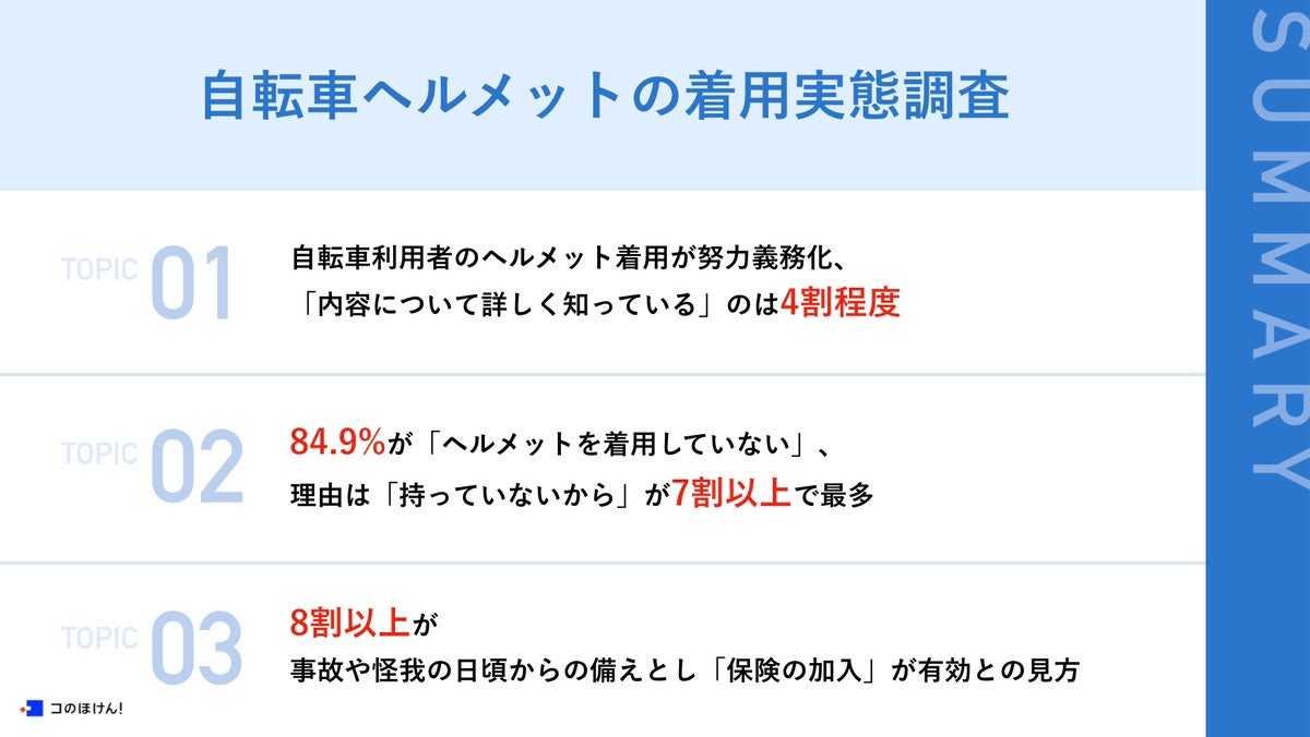 今回の調査では、ヘルメット着用は努力義務化されたものの、実際の利用者には浸透しておらず、新たにヘルメットを買う手間やあくまでも努力義務であることがその背景としてあることが分かりました。しかし、日常的に自転車を使用する中で多くの人が「ヒヤリ」とした経験があり、事故や怪我が他人事ではないということを実感しています。事故や怪我は誰にでも起こり得ることであり、加害者になってしまうこともあるかもしれません。特に自転車は日常的に使用するものですので、予測不能の事態に備えて保険への加入を検討してみてはいかがでしょうか。