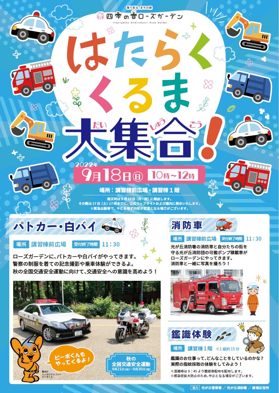 9月18日(日)には子供たちに大人気のパトカーや白バイ、消防車、スケルトン清掃車、ショベルカーなど、はたらくくるまが大集合!ピーポくんも応援に駆け付け、はたらくくるまとの記念撮影や乗車体験ができます。スケルトン清掃車では、普段は見られないゴミ収集車の中を見ることができます。講習棟内では、練馬警察署による鑑識体験会もあります。ぜひお子さま連れでお越しください。