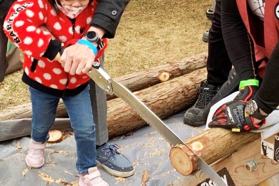 丸太の早切り大会などで優勝経験のあるのこぎり名人が、のこぎりの扱い方をレクチャーしてくれます。また、男性は丸太の早切り、女性やお子さまは100グラム切りにチャレンジできます。