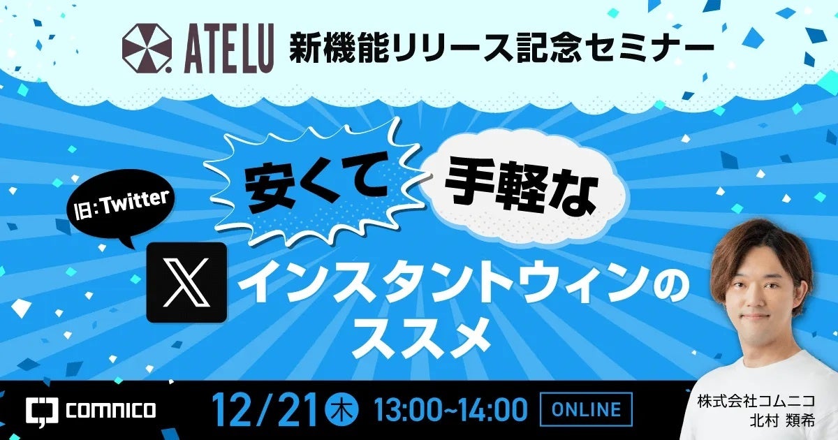 セミナー名:ATELU新機能リリース記念セミナー 安くて手軽なX(旧:Twitter)インスタントウィンのススメ