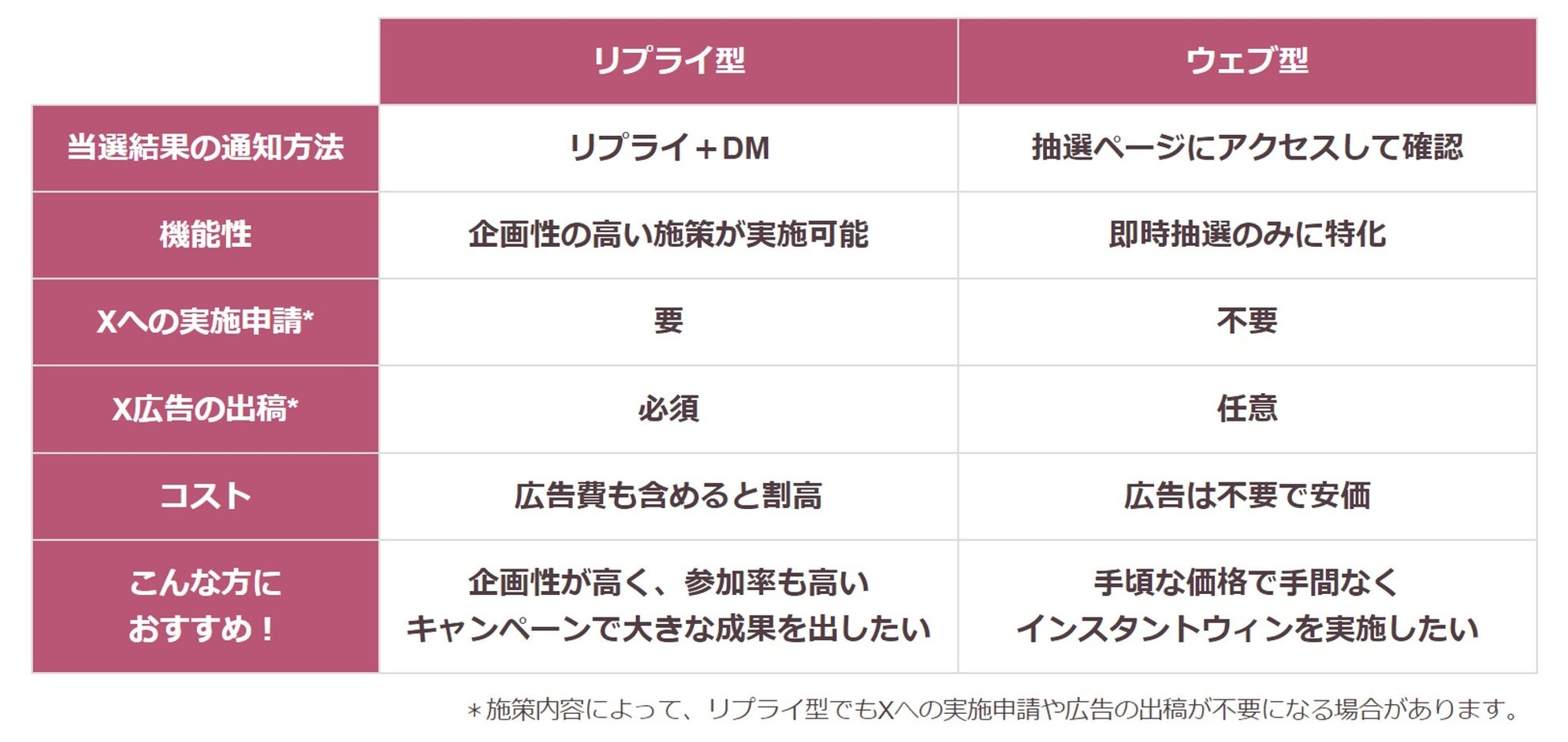 <「リプライ型」と「Web型」のインスタントウィンキャンペーンの比較表>