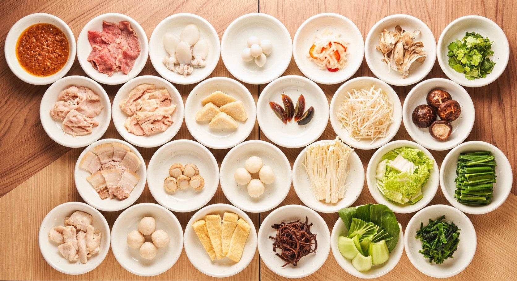 肉、野菜、きのこ、魚介系のボール系など25種類あり、香港では「鶏むね肉」、「豚バラチャーシュー」、「豚ひき肉炒め」が人気です。香港でもシグネチャートッピングとなっている「いかボール」や、「フィッシュボール」、「三角揚げ」は本国から輸入しております。