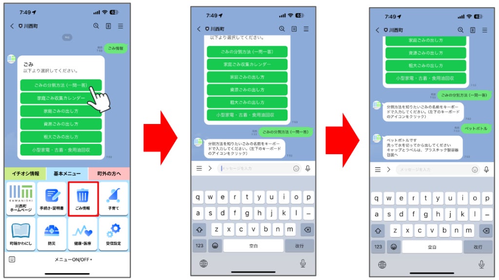 「ごみ情報」では、「ごみの一問一答機能」を搭載しております。LINEのトーク画面に直接「ペットボトル」「乾電池」などの破棄したいごみの具体名を入力することで、分別方法や捨てる際のポイントを自動返答します。