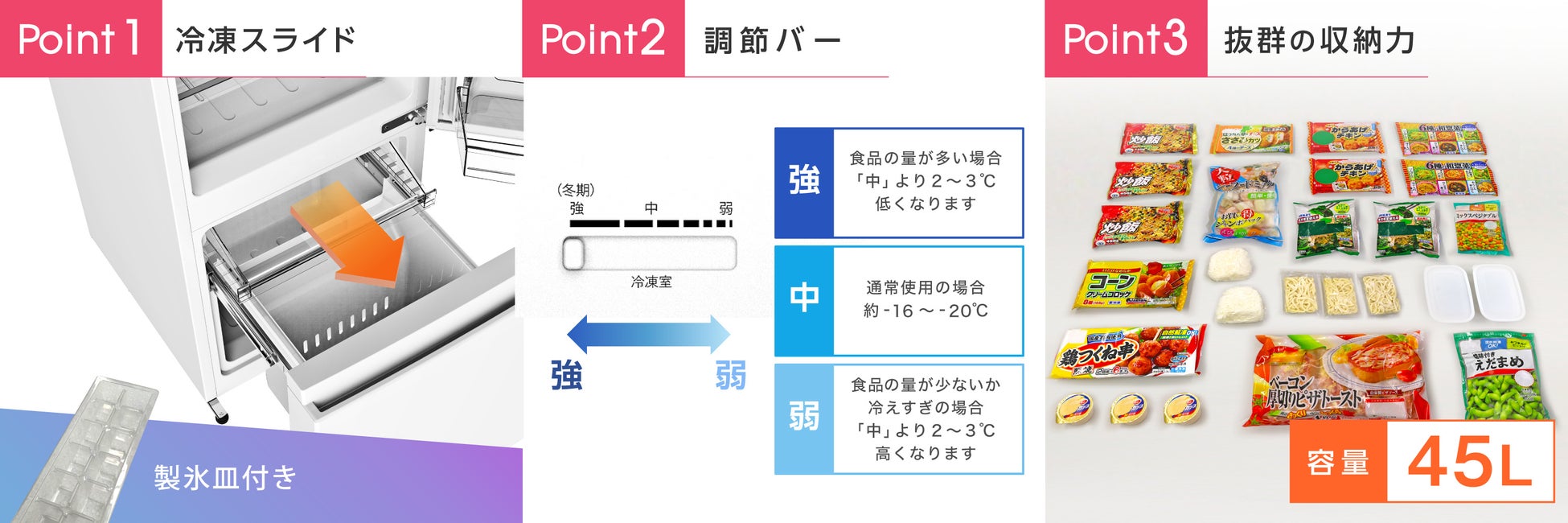 コンパクトな見た目ながらも容量の大きさや収納のしやすさにこだわり、冷蔵室には整理しやすいドアポケットやフリートレー、冷凍室には使いやすいスライドタイプを採用しました。自炊の多い1人暮らしの方や2人暮らしの方におすすめの156L冷凍冷蔵庫です。