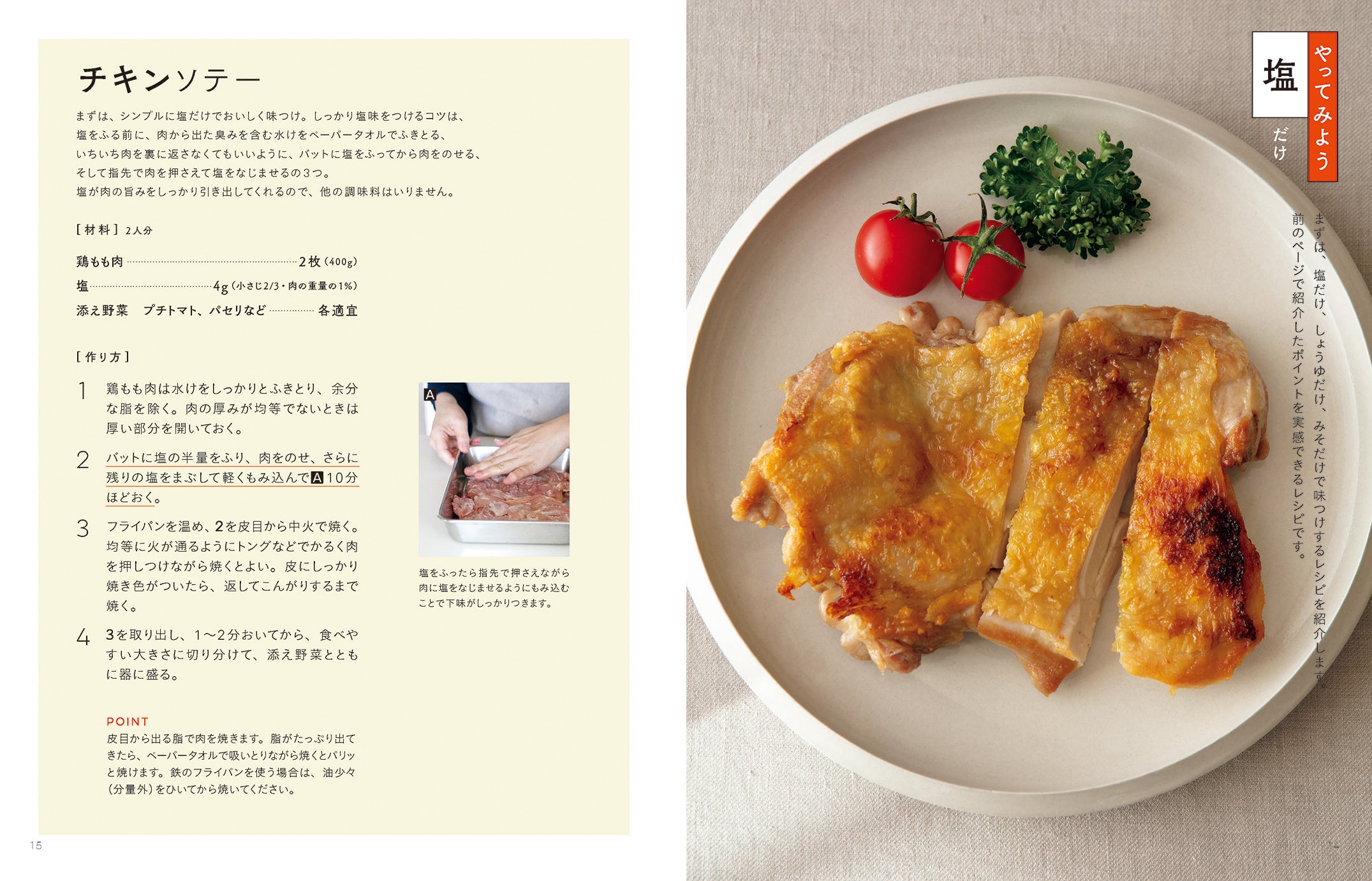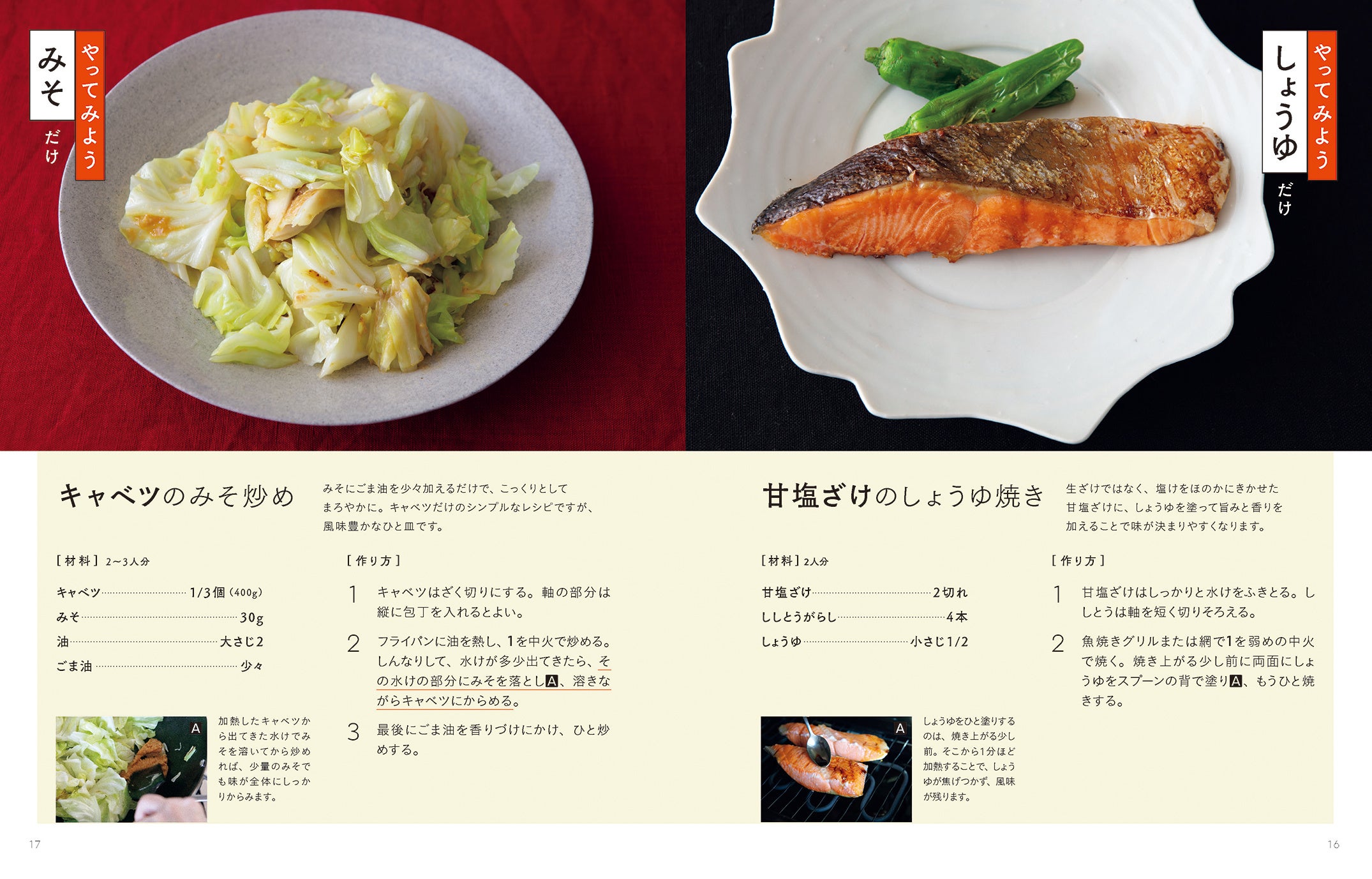 本書では塩だけ、しょうゆだけ、みそだけで味付けたレシピも掲載しており、それぞれの調味料が持つ高いポテンシャルを実感することができるはず。