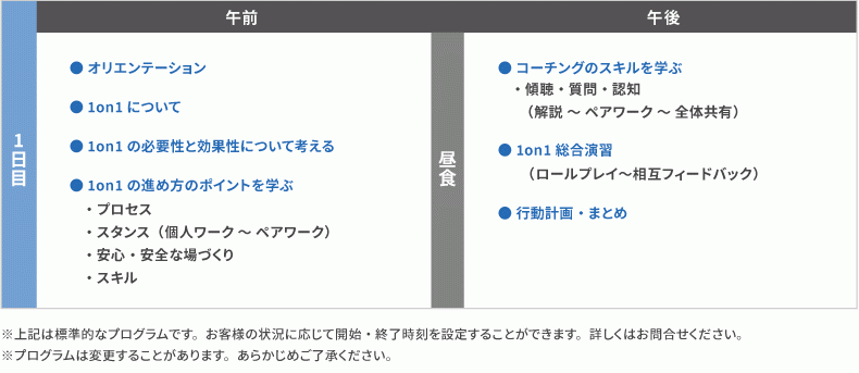 組織・チームのリーダー層が「1on1」ミーティングの必要性を認識し、コーチングスキルを身につけることで、「1on1」ミーティングを効果的に現場で進めていくイメージを持つことを目的としています。