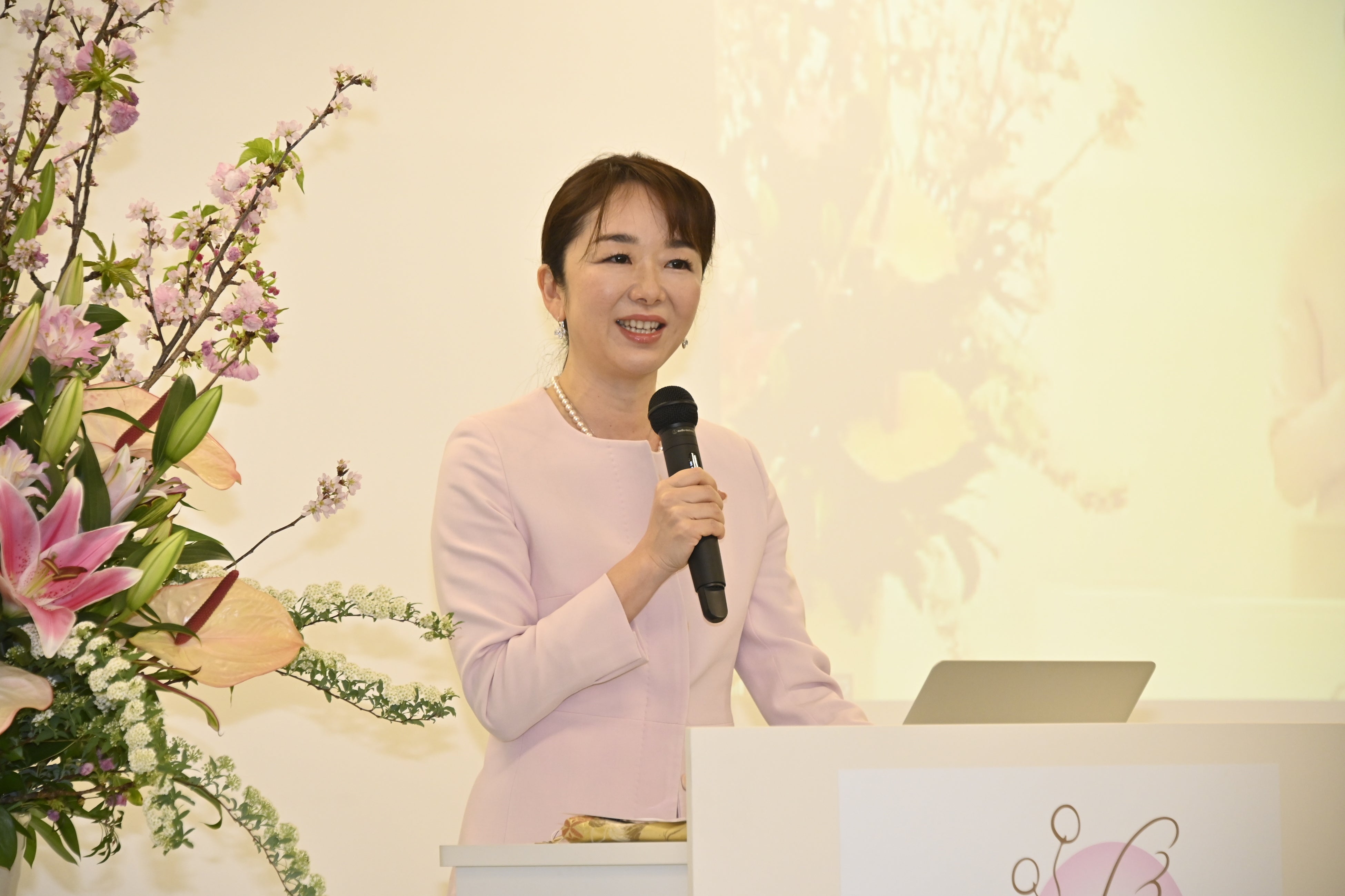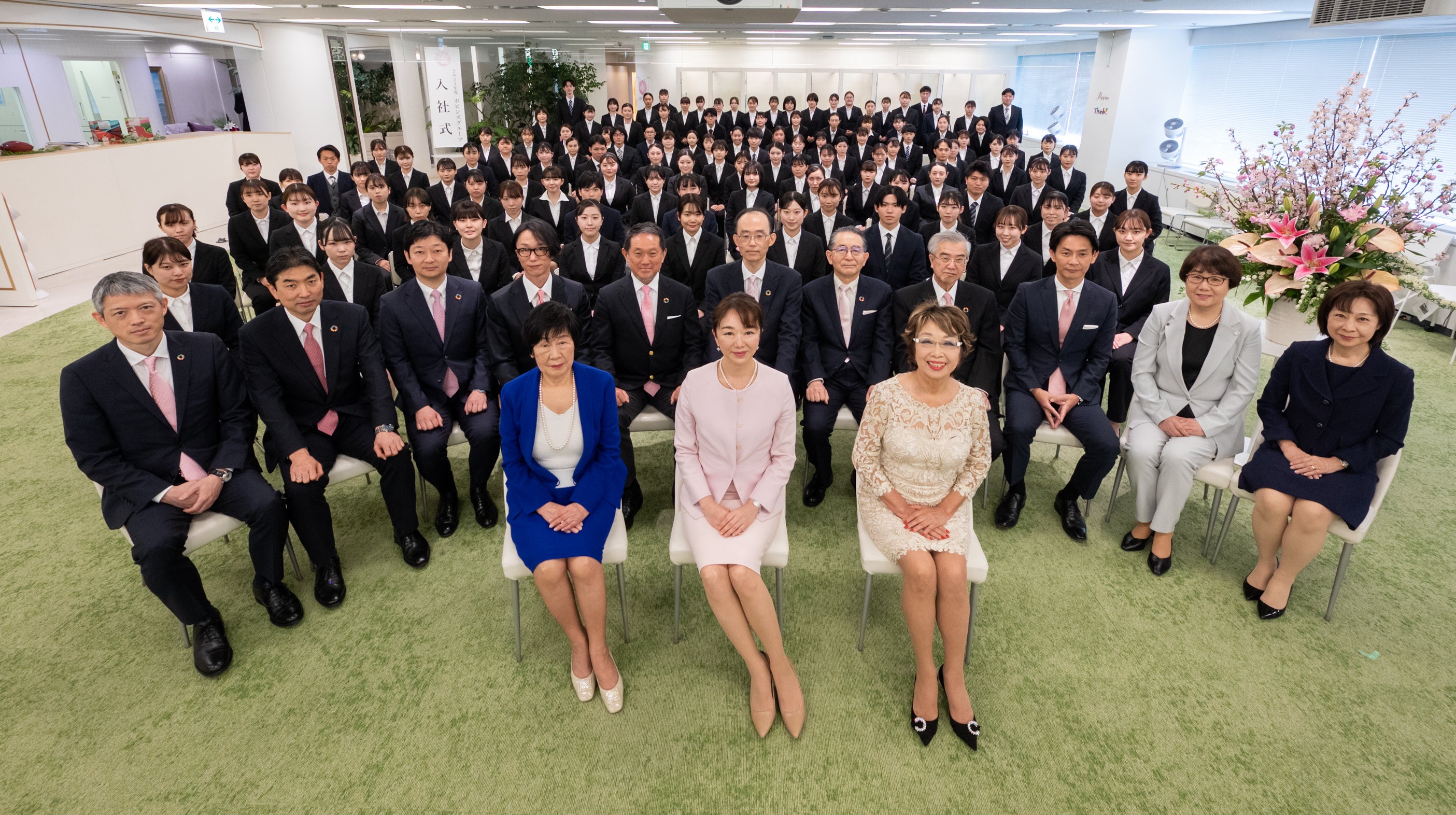 大きな満開の桜をエントランスに設置し新入社員をお出迎え。式典は弊社創業者であり会長の中村紀子、社長の轟麻衣子の祝辞に続き、多くのご祝辞・祝電を頂戴いたしました。来賓としてお茶の水女子大学 学長佐々木泰子様、名誉教授内田伸子様、聖路加国際病院小児科 草川功様、社会福祉法人大五京 理事長杉本五十洋様などにご参加いただきました。また、中央大学教授であり新任社外取締役の小峯力様からは、ご本人の経験などを交えたご祝辞を頂戴いたしました。この3年、コロナ禍で大切なお子様の命をお預かりするエッセンシャルワーカーとして感染症予防に万全を期すことを最優先とし、オンラインでの入社式が続きました。今年は引き続き感染予防対策を万全にしたうえで4年ぶりに対面での開催が実現しました。