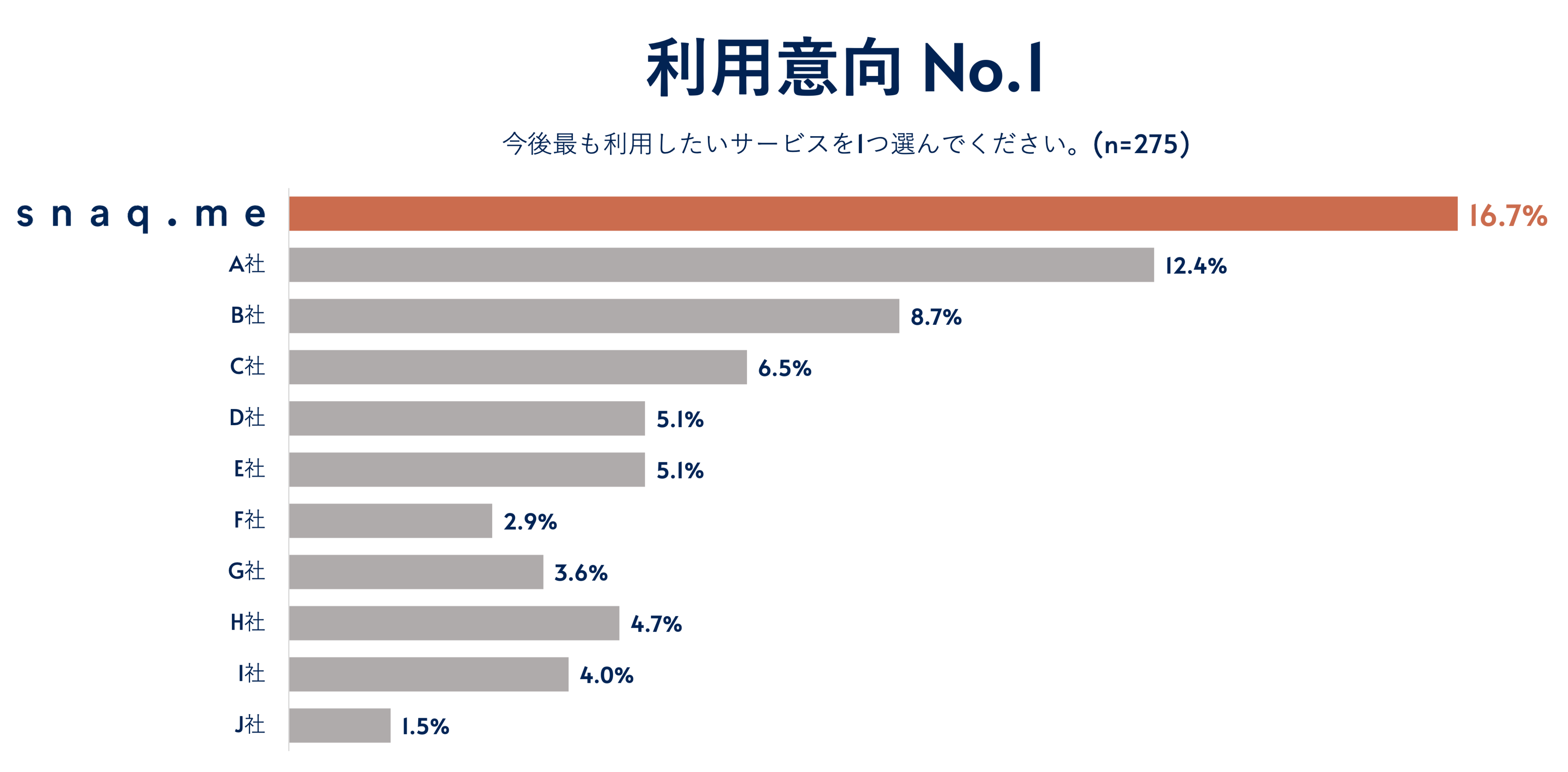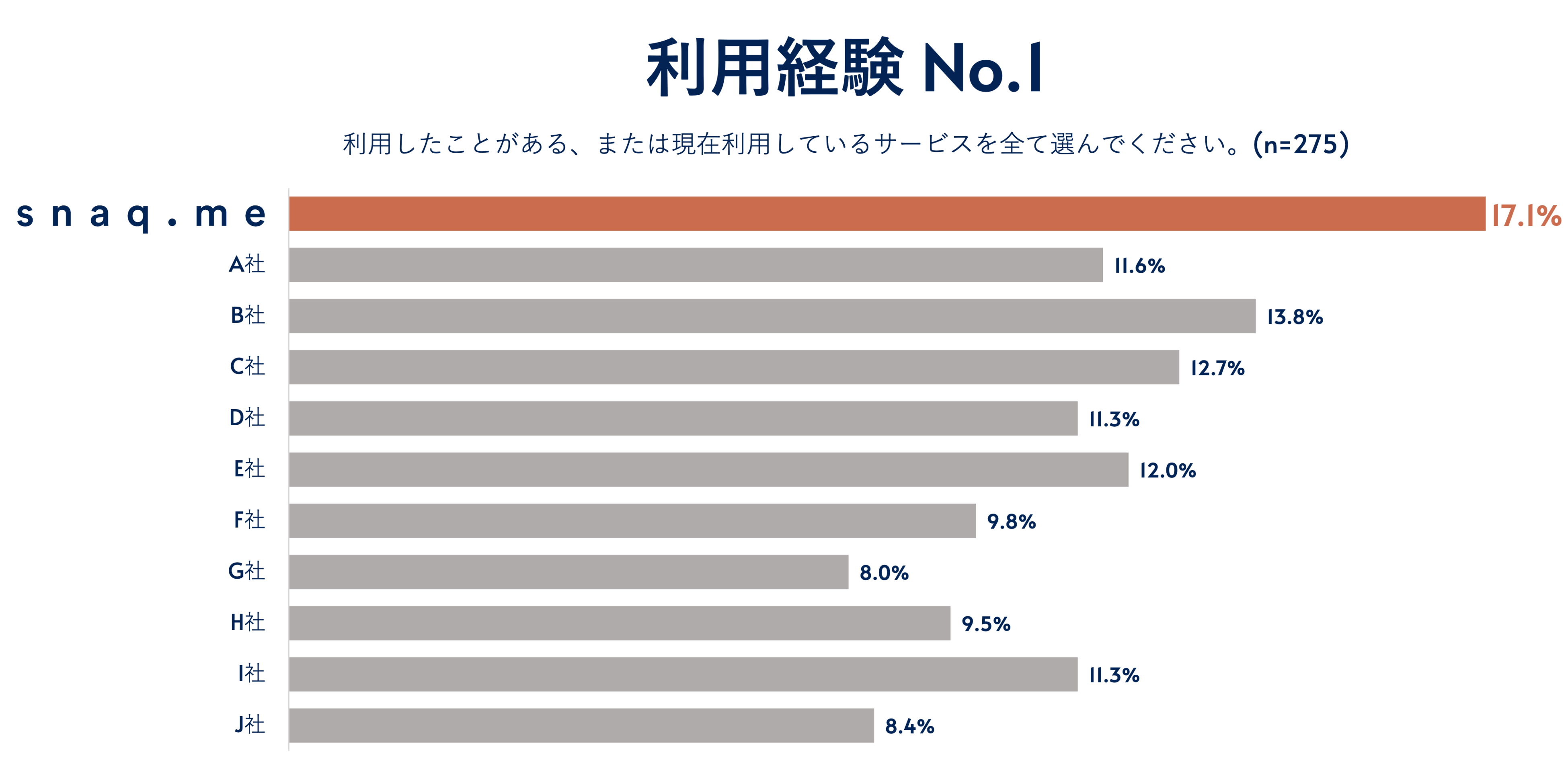 snaq.meが「おやつのサブスクリプションサービス(11社※)」の中で、認知度、利用経験、利用意向の全てで1位を獲得しました。