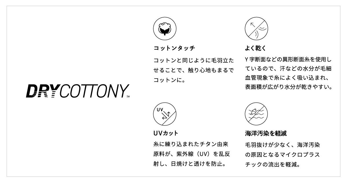 また、Tシャツのボディに使用されているDRYCOTTONY シリーズは、独自技術でリサイクルした繊維由来100%のサステナブルな再生樹脂を素材に使用にした地球環境にも優しいお洋服です。ポリエステルの特性を生かして、吸水性に優れ、乾きやすく、湿度の高い日本の夏でもムレ感なく快適に着用いただけます。また、独自の製法で機能性の高い糸構造のため、まるでコットンのような着心地です。これまで、定番の「BRING T-shirt Basic DRYCOTTONY.」をはじめ、シーズンごとに様々なラインナップを展開しています。