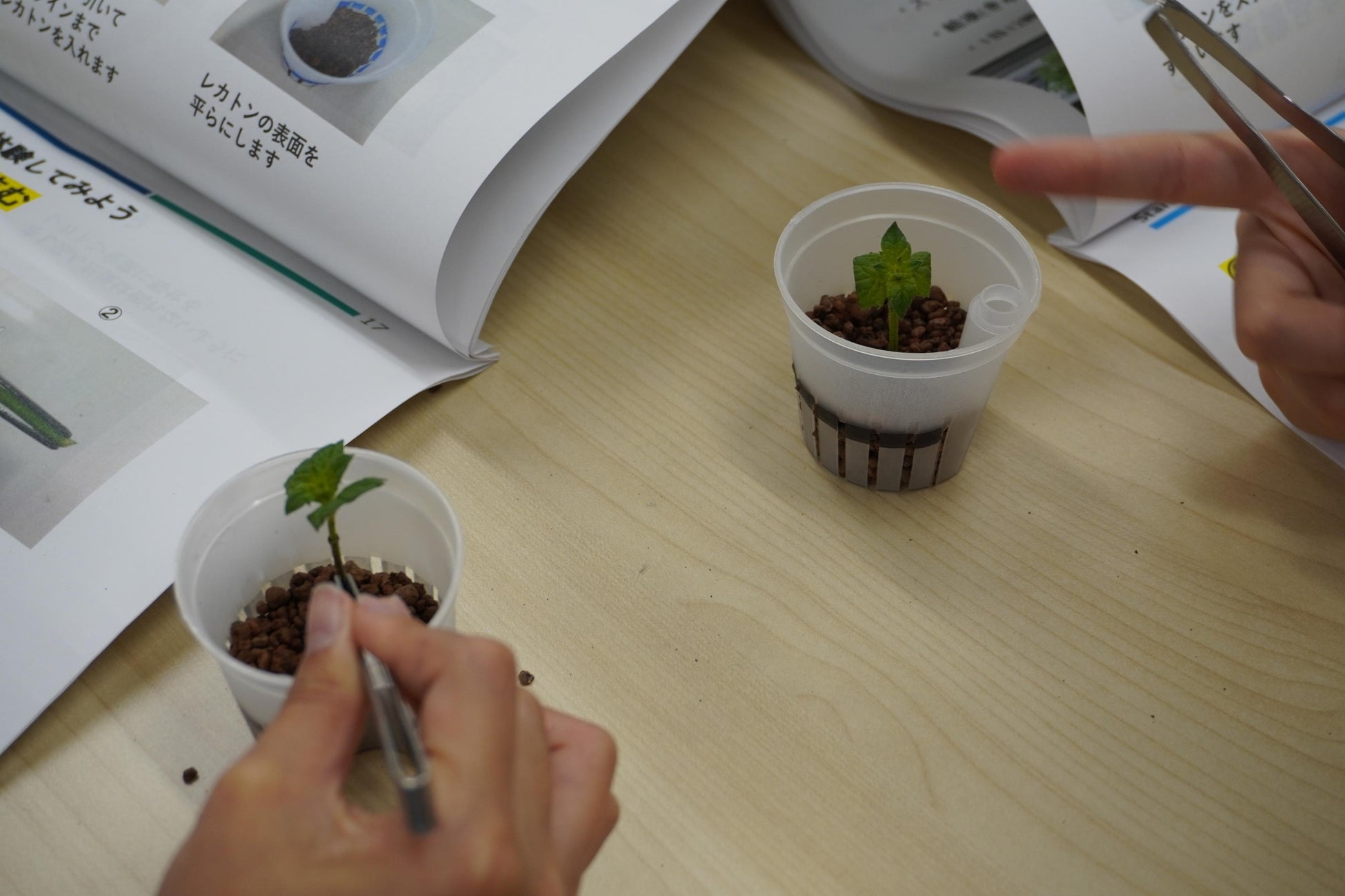アサンプション国際小学校が行う「食育」の学習では、いのちの循環により、自然界と共に生きる私たちの生活のあり方を学び、日常生活に活かしています。今回行った挿し木は、水耕栽培装置に戻し、当社にて育てることを約束しました。約2か月で育ちますので、その様子を生徒へご報告する予定です。