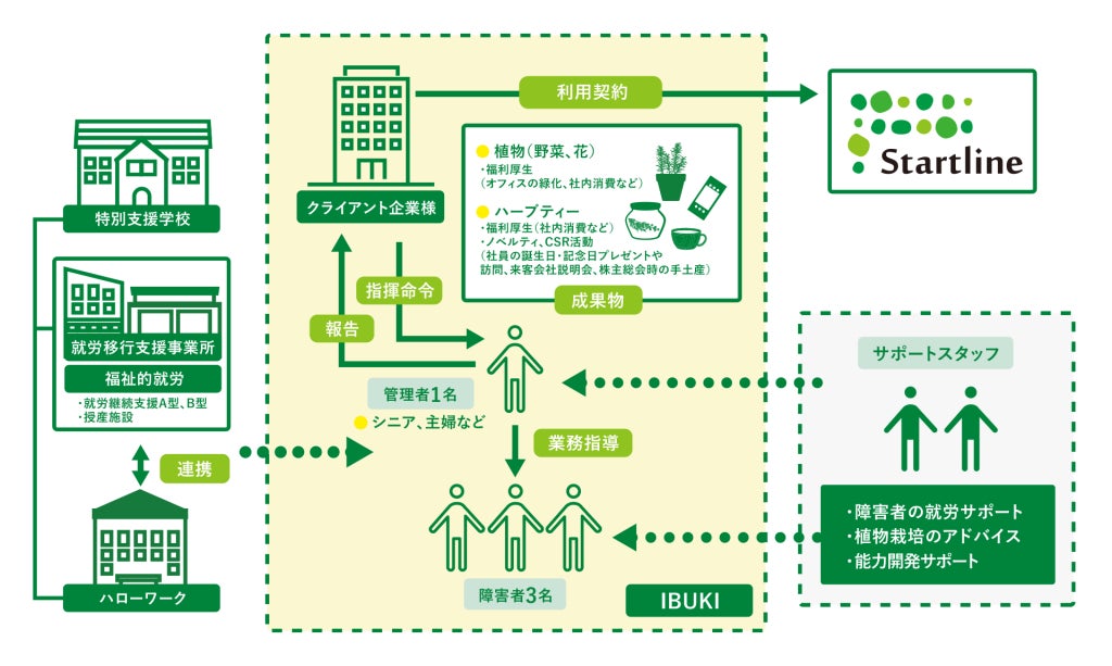 IBUKIは天候の影響を受けにくい屋内型農園を活用した、障害者雇用の仕組みをワンストップで提供するサービスです。