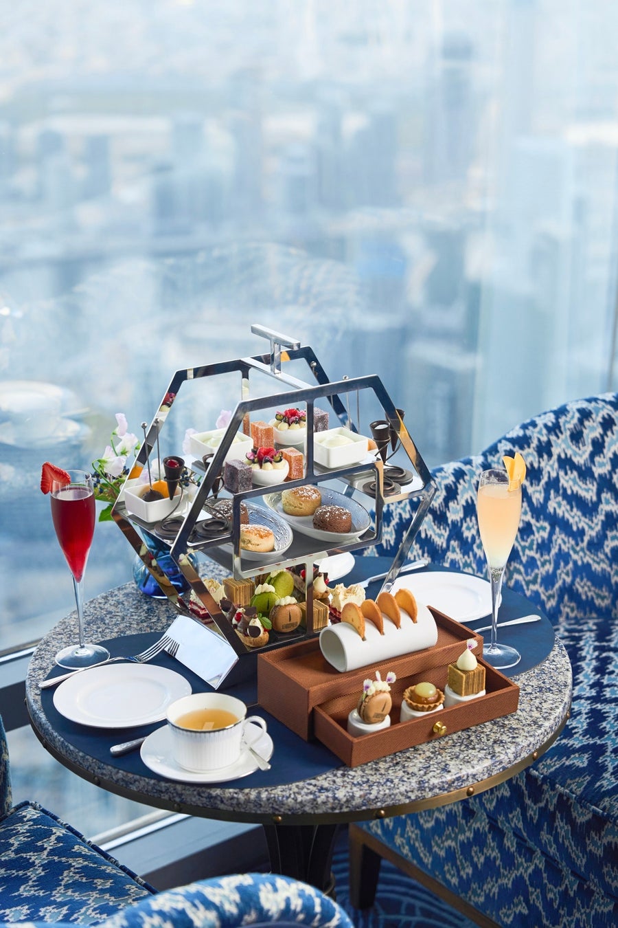 ドバイを象徴する超高層ビル、バージュ・カリファの122階に位置する「アトモスフィア(At.mosphere)」は、世界で最も高い場所にあるラウンジのひとつ。地上442メートルの絶景とともに、ラグジュアリーなアフタヌーンティーを提供しています。毎日12:30〜16:30に提供される「ラグジュアリー・ハイティー」では、窓際のテーブルで、メインコースをはじめ、彩り豊かなケーキやミニサンドイッチ、焼きたてのスコーンにクロテッドクリームとジャム、こだわりのホット&リフレッシュドリンクをお楽しみいただけます。非日常の優雅なひとときを叶える、特別なアフタヌーンティーです。