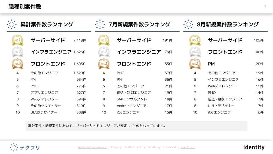 累計案件・新規案件において、サーバーサイドエンジニアが安定して1位となっています。