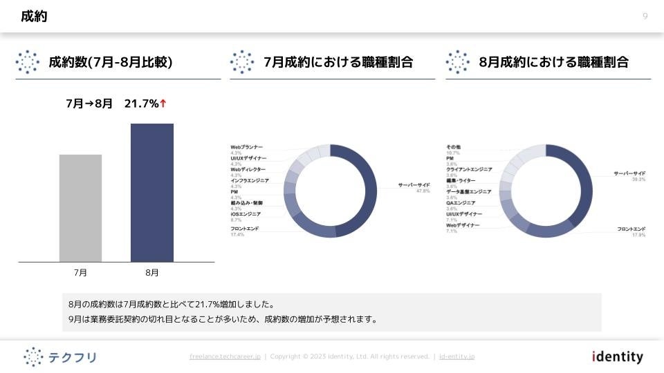 8月の成約数は7月成約数と比べて21.7%増加しました。9月は業務委託契約の切れ目となることが多いため、成約数の増加が予想されます。