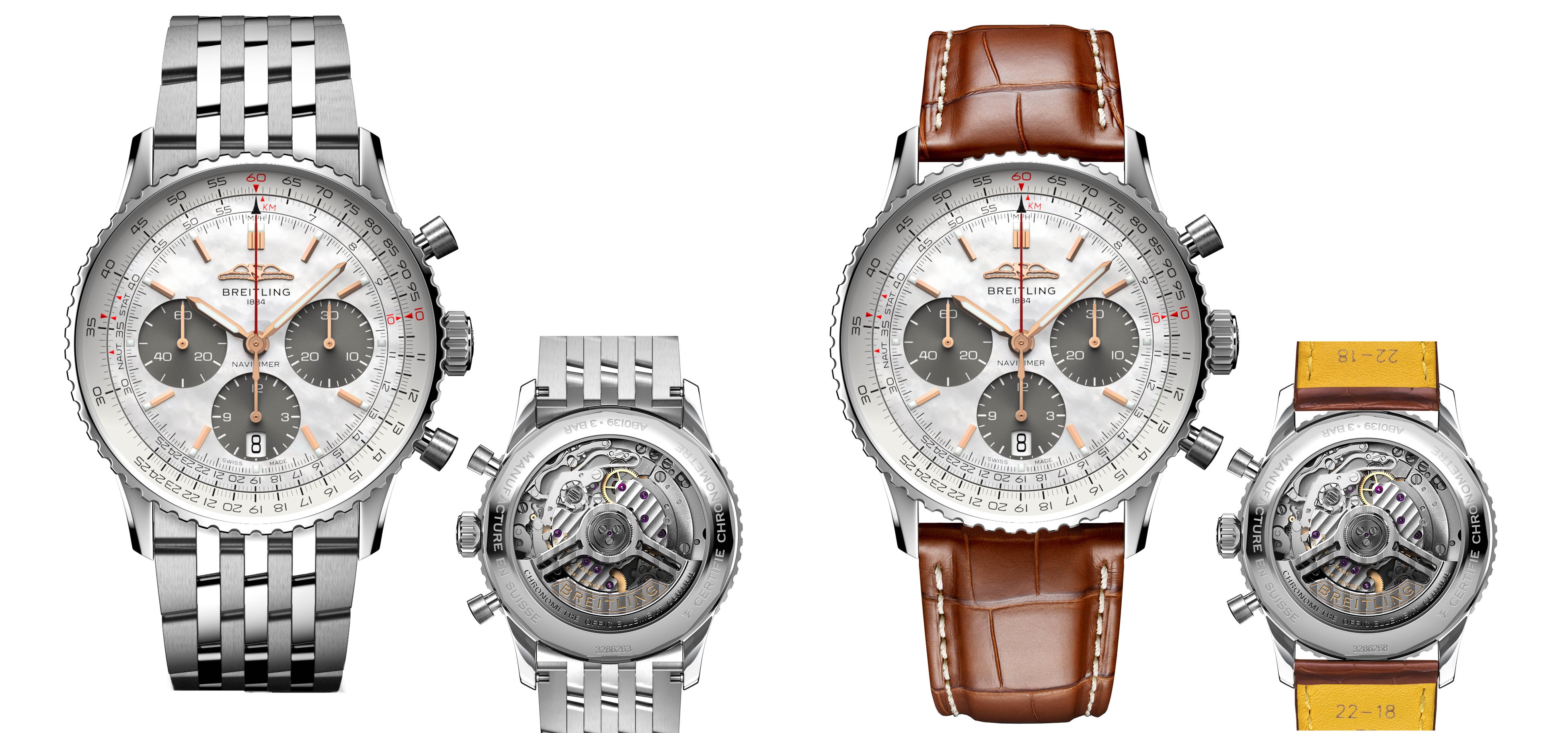 ナビタイマー B01 クロノグラフ 41 ホワイト マザーオブパール ジャパン エディションは、機能性とスタイルを併せ持った特別なナビタイマーです。ナビタイマー B01 クロノグラフ 41に日本限定モデルとして加わるこのモデルでは、文字盤に真珠母貝を配しました。天然由来素材だからこそ、一つ一つのダイヤルの輝きに個性があります。エンブレム、インデックス、各種ハンズ(時・分・秒・クロノグラフ積算計)はゴールドカラーに。控えめなグレーのサブダイヤルと調和して、計器であるナビタイマーに贅沢な華やかさを加えています。ストラップは、シックなブラウンのアリゲーターまたはスポーティな7連メタルブレスレットをお選びいただくことができます。