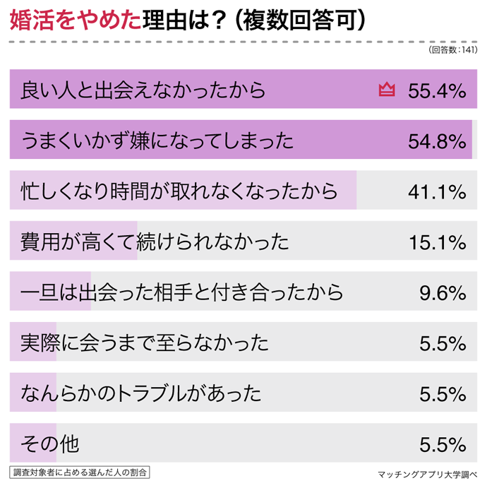 - 婚活をやめた1番の理由は「良い人と出会えなかったから」で55.4%