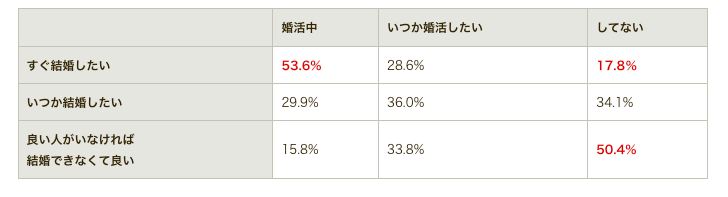 このことから、結婚願望と実際の婚活状況には負の相関関係があるといえそうです。