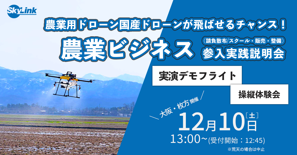 ドローンの販売や産業向けソリューションを展開する、SkyLink Japan(株式会社WorldLink & Company 本社:京都市 北区、代表取締役社⻑:須⽥信也)は、12/10(⼟)にて『農業用国産ドローンが飛ばせるチャンス!農業ビジネス参⼊実践説明会』 を開催いたします。