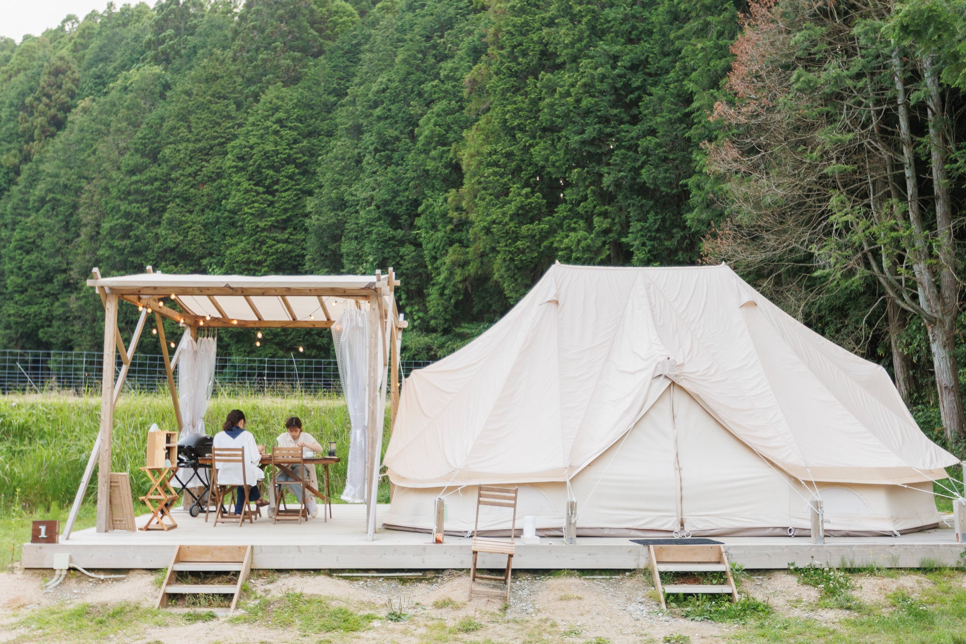 テント内装はアウトドアインフルエンサーのYURIEさん(@yuriexx67)がコーディネートした、異国を思わせる風景や空気感を持つ三瀬村のイメージをもとにヨーロッパ風のシャビーシックな内装で統一。老若男女問わず好評をいただいております。