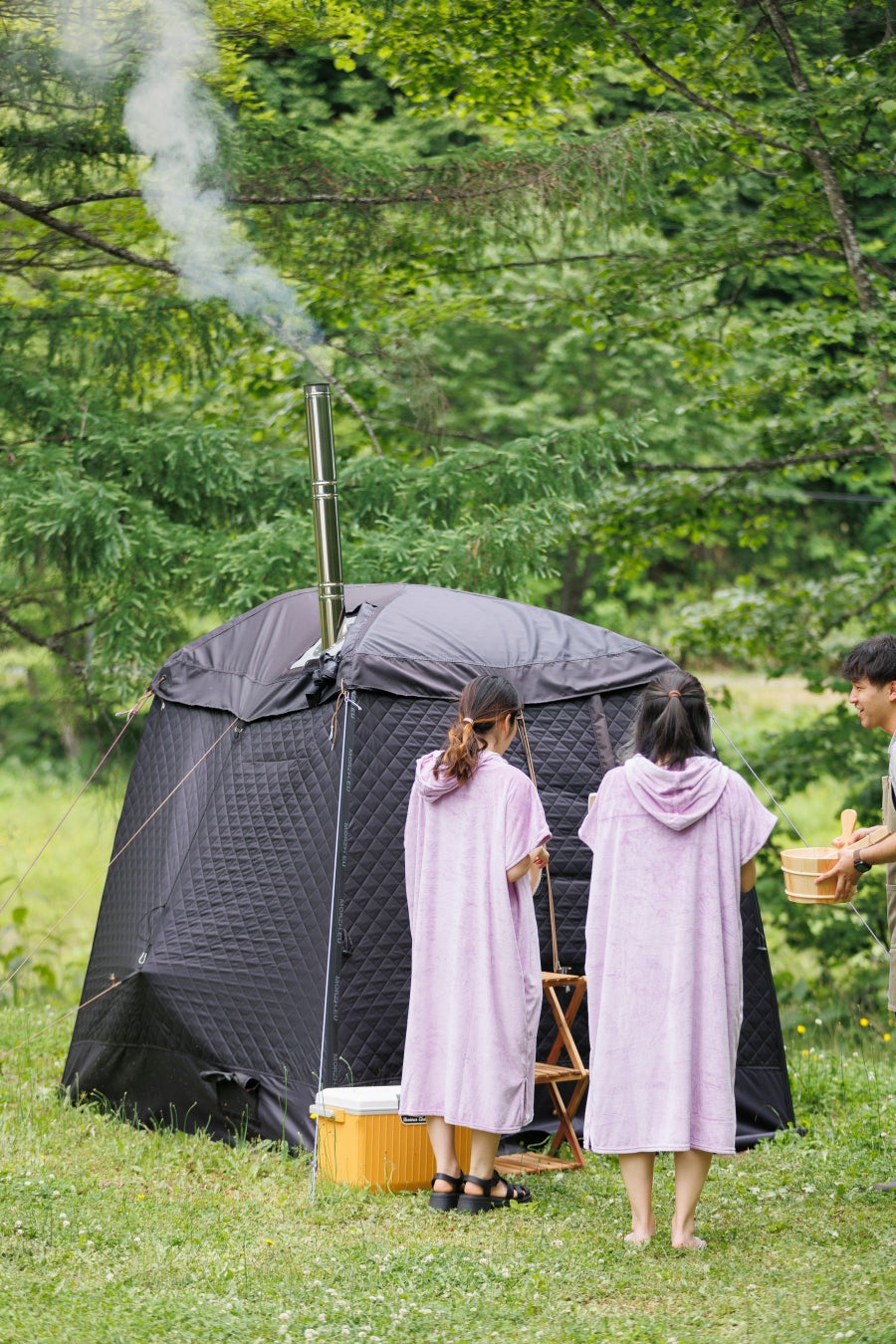 三瀬高原のみどりの中、カラダもココロも『ととのう』体験をお楽しみいただけるよう、2023年より1日2組限定でテントサウナ体験を開始しました。お好きな香りのアロマウォーターで、セルフロウリュを行えば、テント内はたちまち100℃まで上昇。
