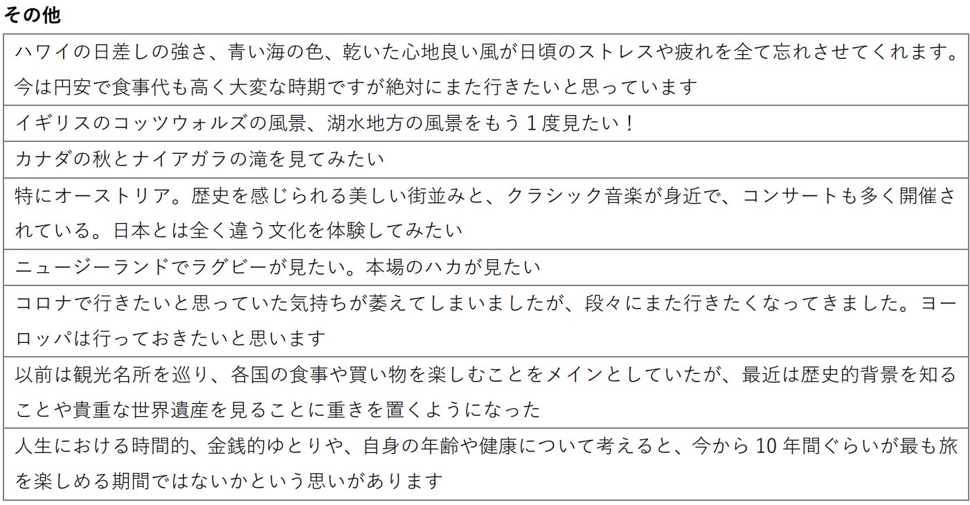 リピート訪欧もありますが、殆どが行ったことのない地を選択。「未知の地球や文化を五感で感じたい」という願いからなのでしょう。行っておきたい理由に「オーロラを見たい」「歴史的建造物(ヴェルサイユ宮殿、サグラダファミリアなど)を見たい」という希望が目立ちます。「ヨーロッパは遠いので、まだ動けるうちに行っておきたい」(64歳)という世代ならではの記述も見られました。