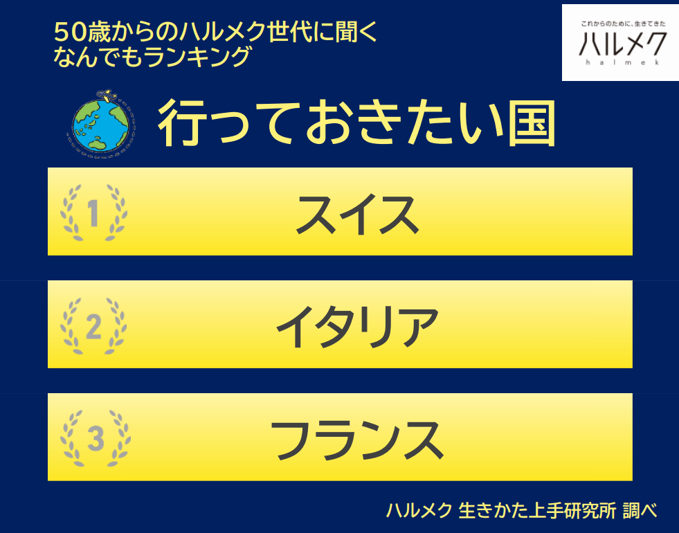 【50歳からのハルメク世代に聞く なんでもランキング】50歳以上の女性が選ぶ「行っておきたい国」1位は『スイス』