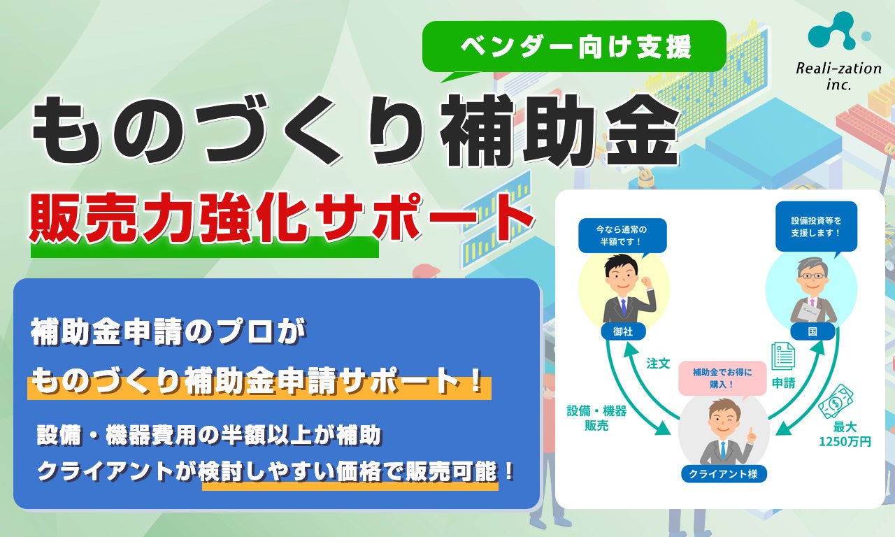 株式会社リアリゼイション(東京都渋谷区)は、「ものづくり補助金」を活用し「機械・装置・システム販売企業」を販売する事業者様向けの販売力強化サポートを開始しました。