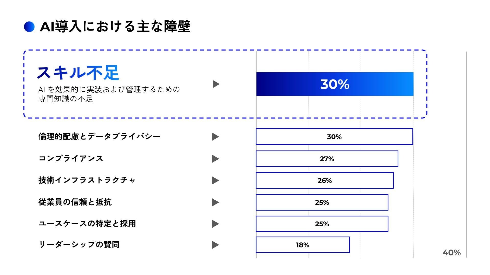 AIの活用が企業競争力の鍵となるなか、多くの企業が「AI導入後の活用・定着」と「AI人材の質・量の不足」というふたつの壁に直面しています。ニーズの高まりに対して実際の業務でAIを活用できる人材が不足しており、その育成が急務となっています。