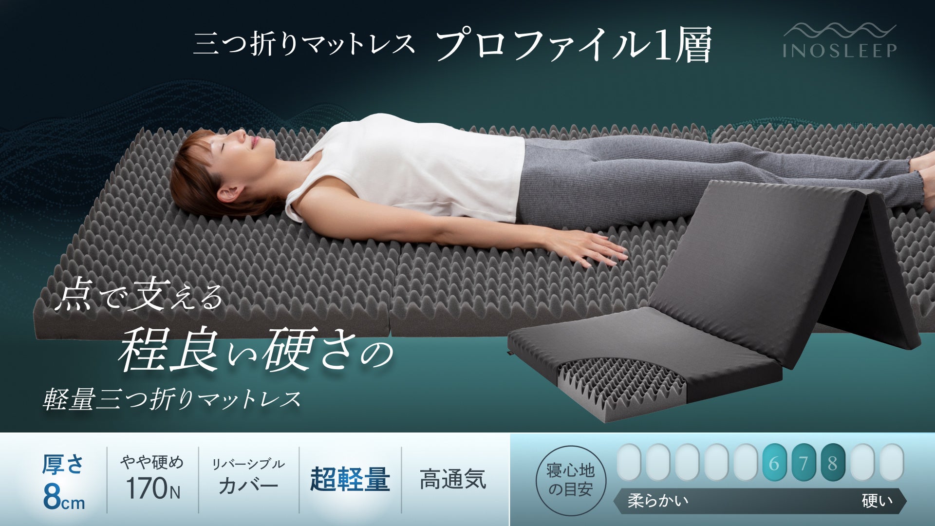 敷布団には戻れない快適さ。INOSLEEPのマットレスなら、3層になる点で支える構造で、蒸れゼロ。表面で受けた加重をさらに下層へ分散。体圧の偏りをなくして理想の寝姿勢を保ちます。