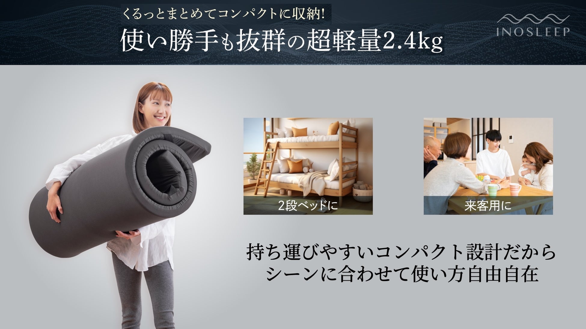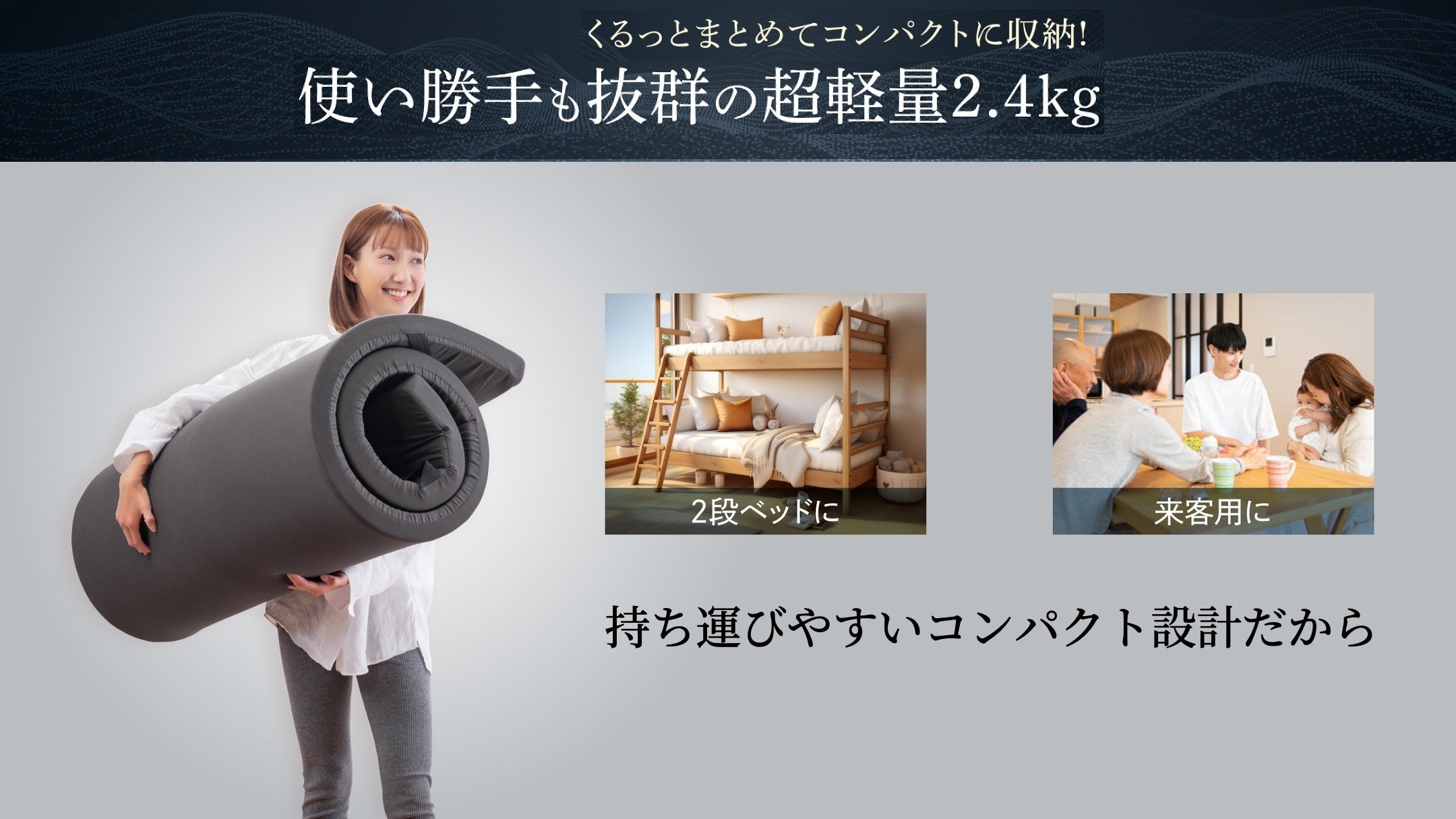 超軽量3.2kgで、持ち運びや収納に力を使いません。女性でも立て掛けできるため湿気対策も楽に簡単に行えます。使わないときは三つ折りにできて置き場にも困らずコンパクト。普段使いはもちろん、来客用や外泊用にもおすすめです。