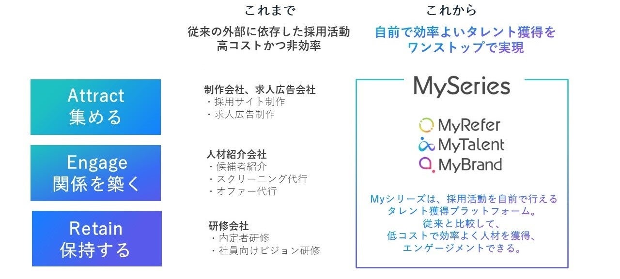 「Myシリーズ」とは、採用活動をマーケティングに変革し、優秀な人材を効率よく自前で獲得できるタレント獲得プラットフォームです。これまで「Myシリーズ」として、国内最大のリファラル採用サービス「MyRefer」、採用MAサービス「MyTalent」、採用ブランディングサービス「MyBrand」を展開してまいりました。エージェントや求人広告に依存した従来の採用手法から脱却し、競合とバッティングせずに、転職潜在層から応募獲得、自社の魅力付け、入社後の活躍を見据えたタレント・アクイジションを実現します。累計導入企業は1,000社を超え、企業規模や業界問わず、多数の領域でご利用いただいております。