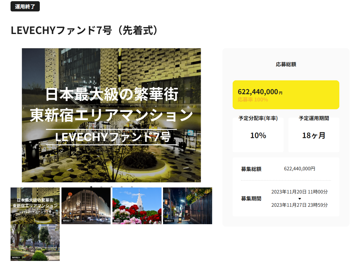 「LEVECHYファンド7号」は、18ヶ月の運用期間を想定しておりましたが、実際の運用期間は659日となりました。当初の運用期間より時間を要してしまった事をお詫び申し上げます。