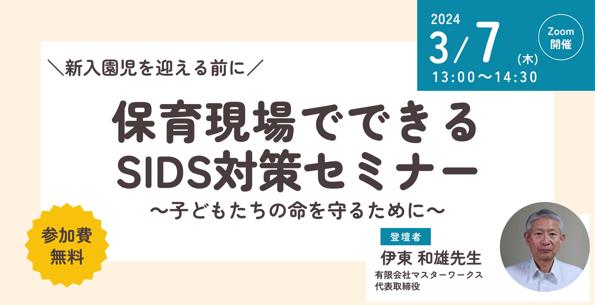 新年度を迎えるにあたり、預かり初期の事故について不安を抱えている保育士も多いと思います。本セミナーでは、30年以上にわたりSIDS予防の活動をされている伊東和雄氏(有限会社マスターワークス代表取締役)にご登壇いただき、現場に即した対応方法についてお話をしていただきます。