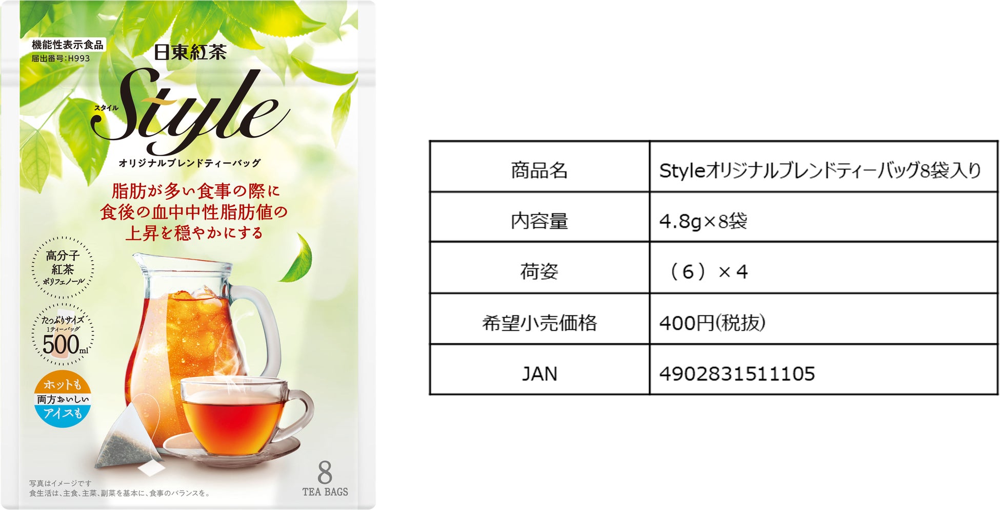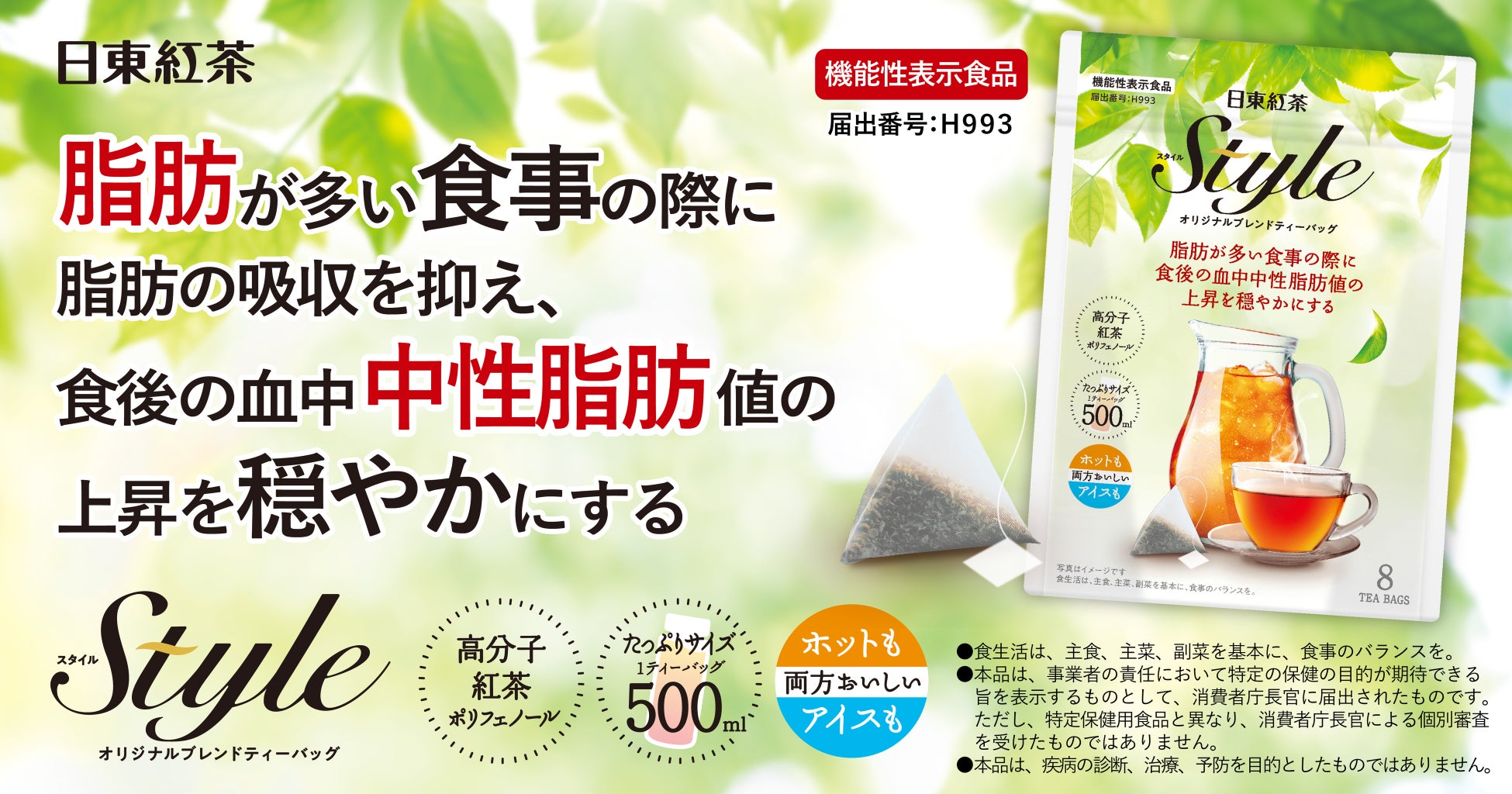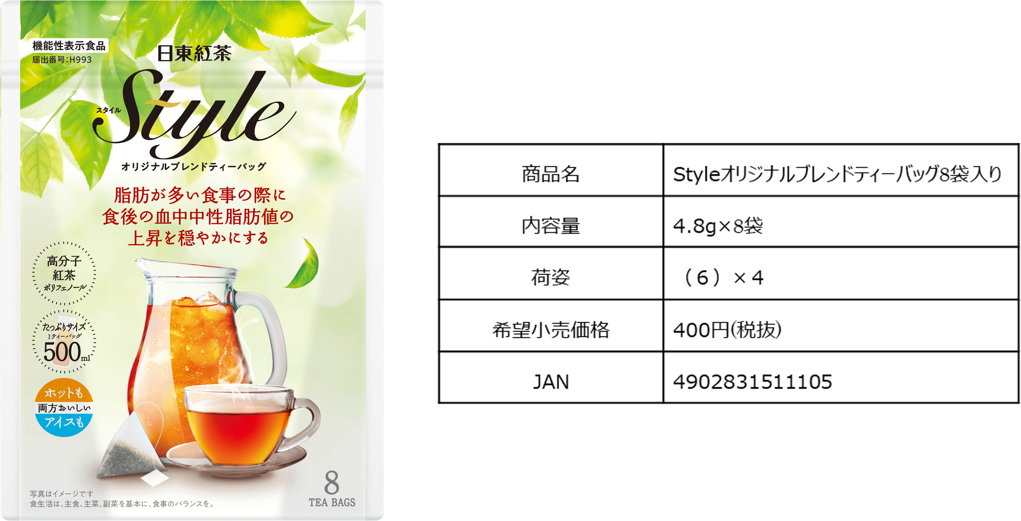 こうした中性脂肪に対するニーズの高まりに注目し、当社で長年研究している紅茶ポリフェノールの機能研究を掛け合わせ、より多くのお客様に日常生活に取り入れやすい形で健康習慣として「紅茶」を取り入れていただくことを目指した商品開発に着手。脂肪が多い食事の際に、脂肪の吸収を抑え、食後の血中中性脂肪の上昇を緩やかにする「高分子紅茶ポリフェノール」を配合した機能性表示食品『Style オリジナルブレンドティーバッグ 8袋入り』を発売することにいたしました。