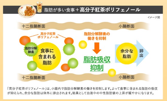 高分子紅茶ポリフェノール(テアフラビンとして)には、脂肪が多い食事の際に、脂肪の吸収を抑え、食後の血中中性脂肪値の上昇を緩やかにする機能があることが報告されています。