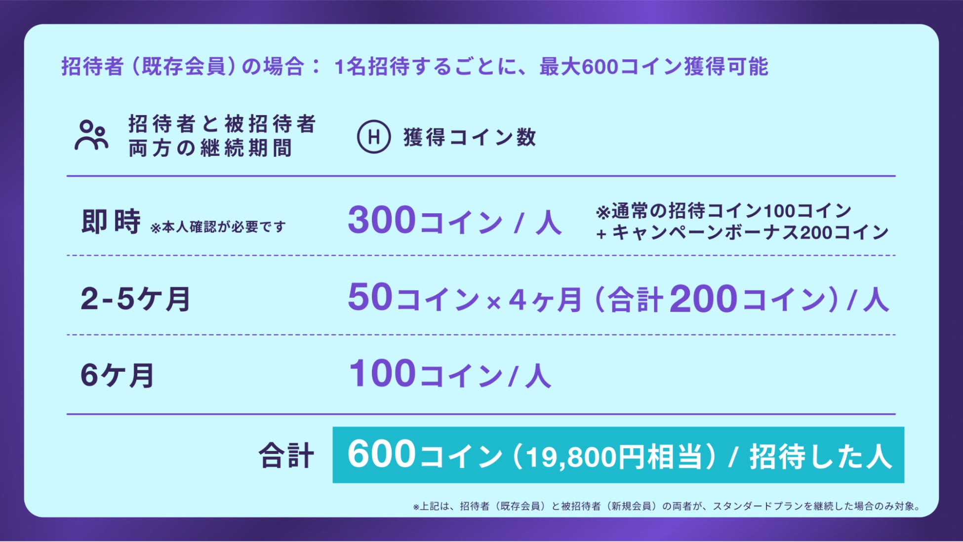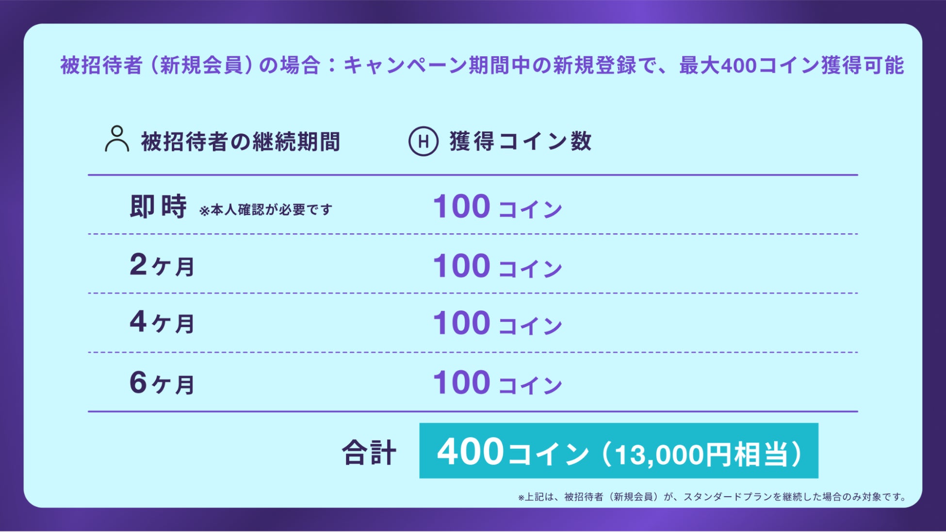 最長6ヶ月間、招待者(既存会員)と被招待者(新規会員)の両者が「スタンダードプラン」を継続いただくと、招待者1名につき、招待者(既存会員)に最大600コイン、被招待者(新規会員)に最大400コイン、合計で1,000コイン(3.3万円相当)を獲得いただけます。