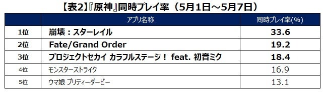 最も同時にプレイされていたのは『崩壊:スターレイル』の33.6%。こちらも2位の『プロジェクトセカイ カラフルステージ! Feat. 初音ミク』に対し10ポイント以上の差をつけています。【表2】