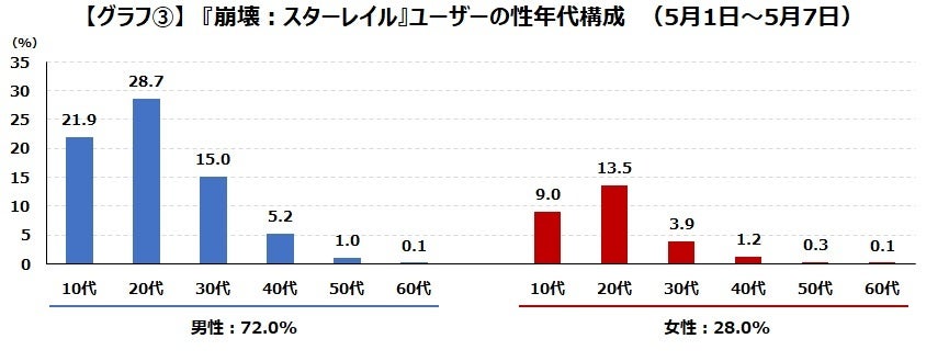 『崩壊:スターレイル』は、男性72.0%:女性28.0%と、7割以上が男性ユーザーで占められています。ボリュームゾーンは10代から20代の男性となっており、この両年代男性だけで5割以上を占めています。【グラフ③】