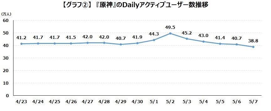 比較対象として『原神』のDAUを見てみます。同期間の『原神』のDAUは40万前後で推移しています。『崩壊:スターレイル』の4月30日以降の推移では『原神』よりも10万人程度多いDAUで推移していることがわかります。【グラフ➁】